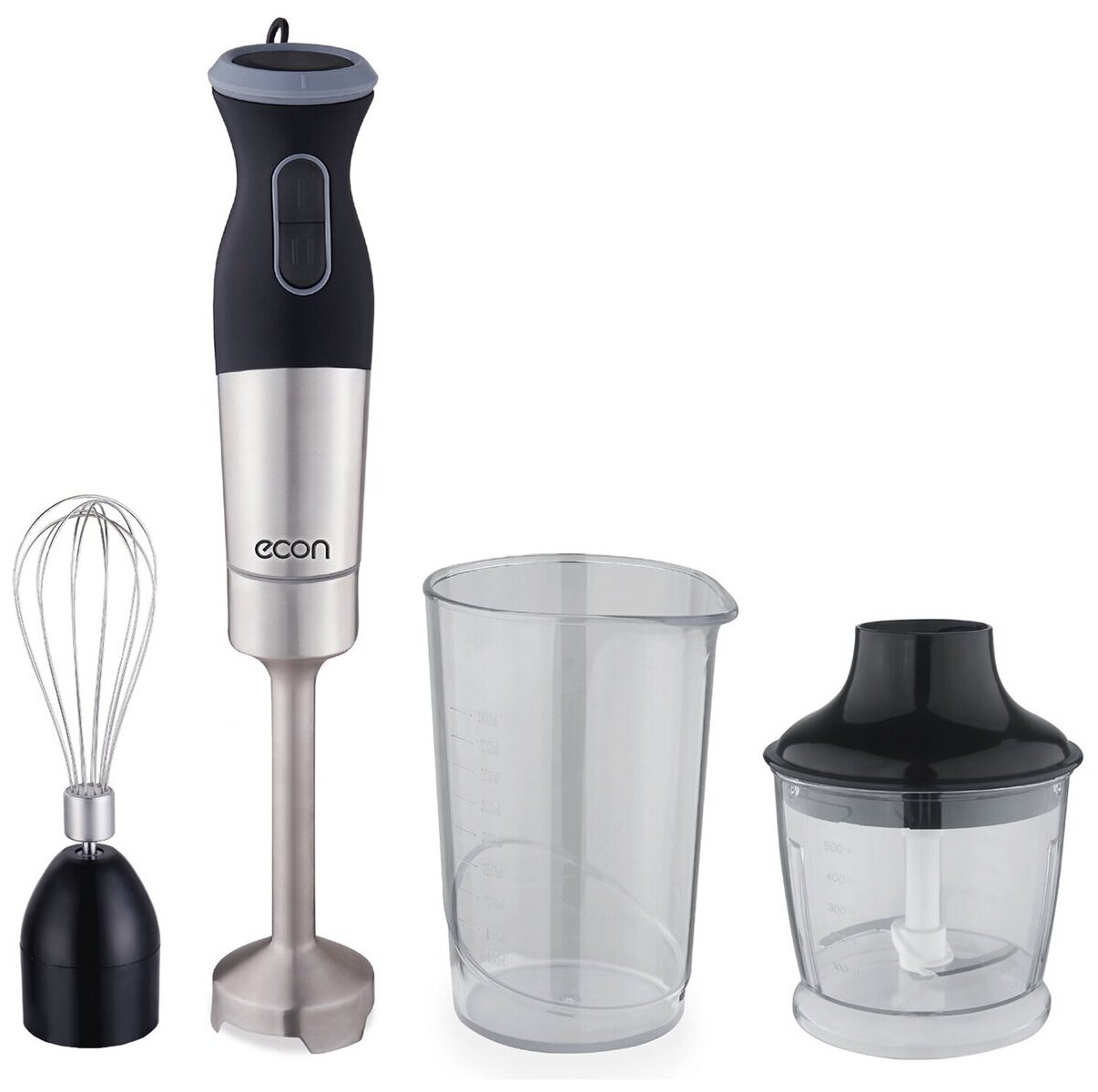 Type: immersion, maximum power: 1000 W, immersion part material: metal, jug material: plastic, attachments: whisk, chopper, included: measuring cup, modes: pulse, chopper container