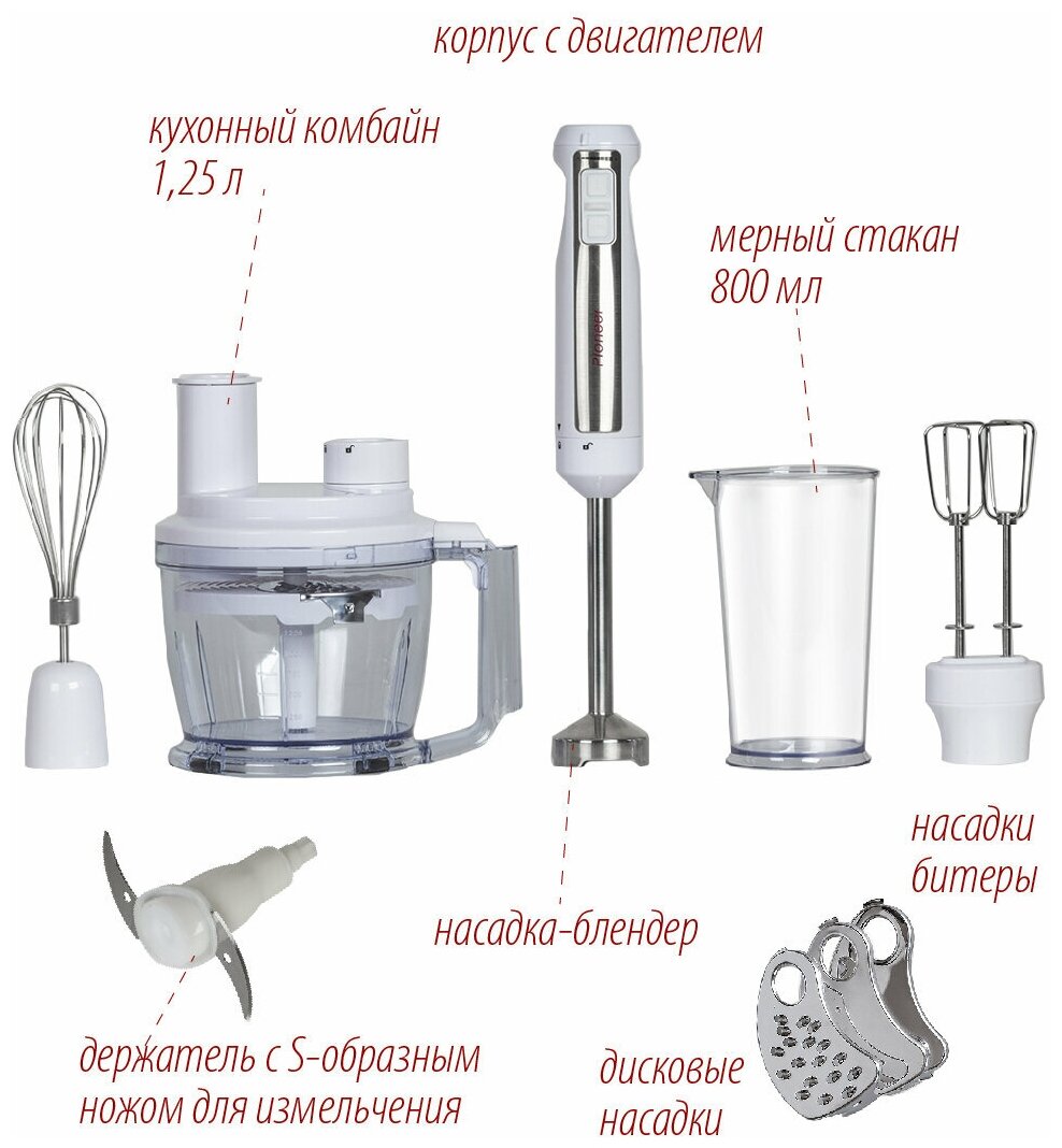 Type: submersible, maximum power: 1000 W, material of submersible part: metal, attachments: whisk, chopper, grater, with whisk; with chopper; with measuring cup, included: measuring cup, additional