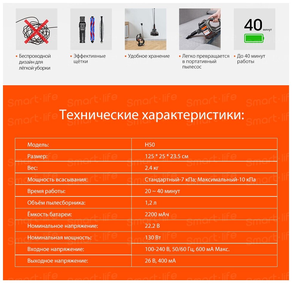Cleaning type: dry, power supply: battery, battery life: 40 min, battery type included: Li-Ion, detachable hand vacuum cleaner, equipment: turbo brush, crevice nozzle, design features: in