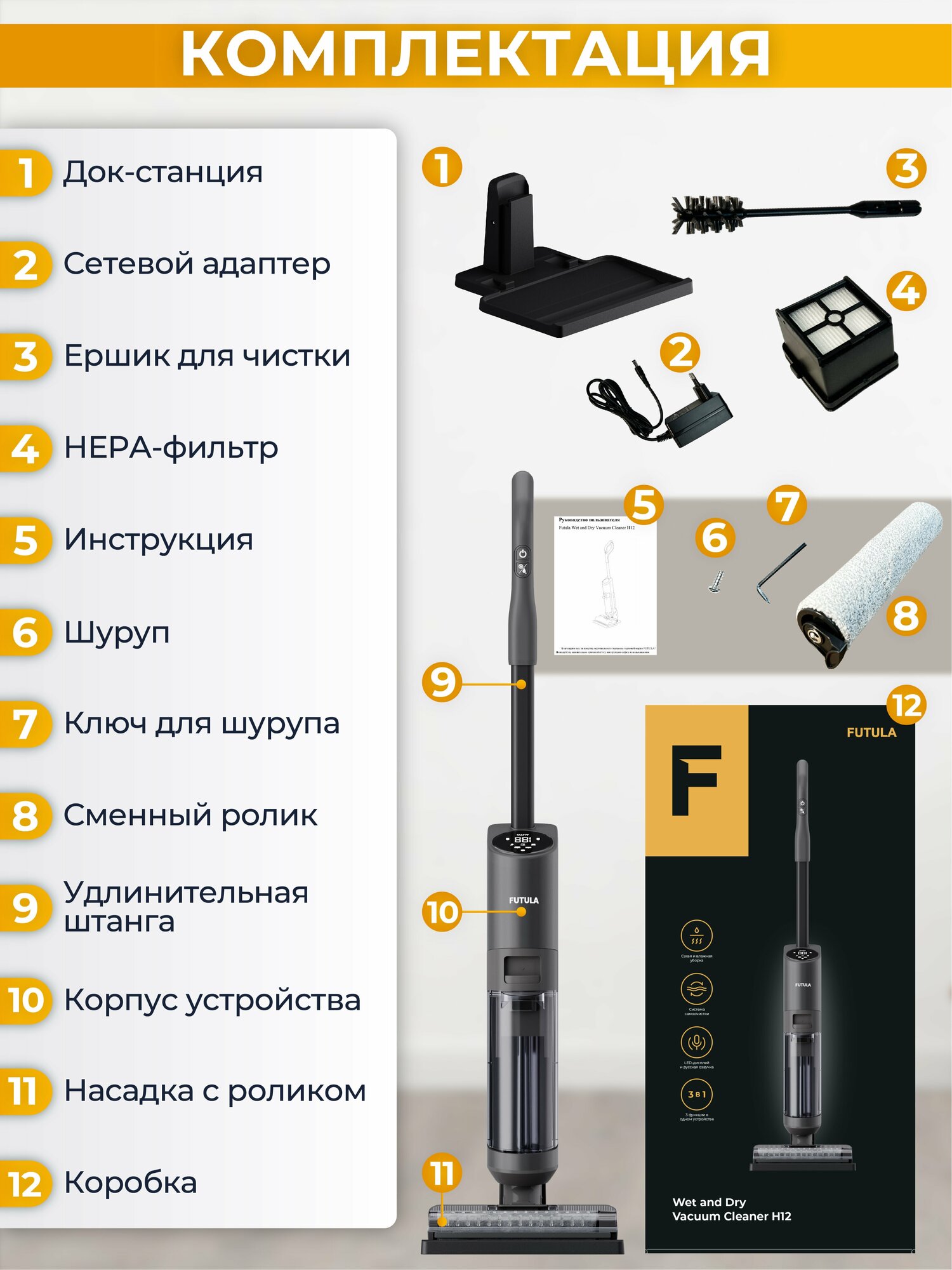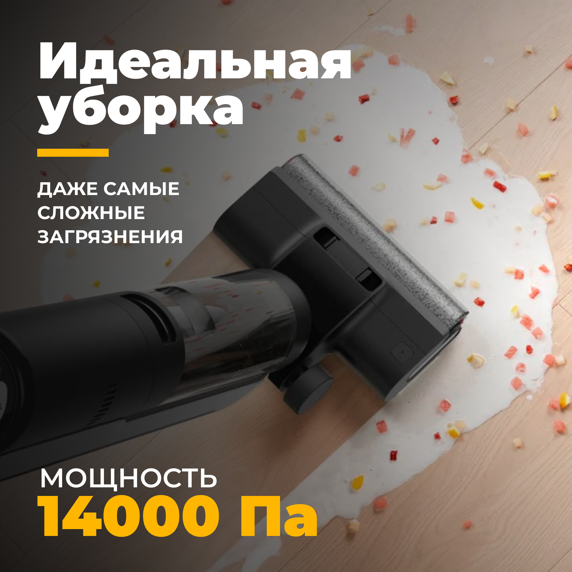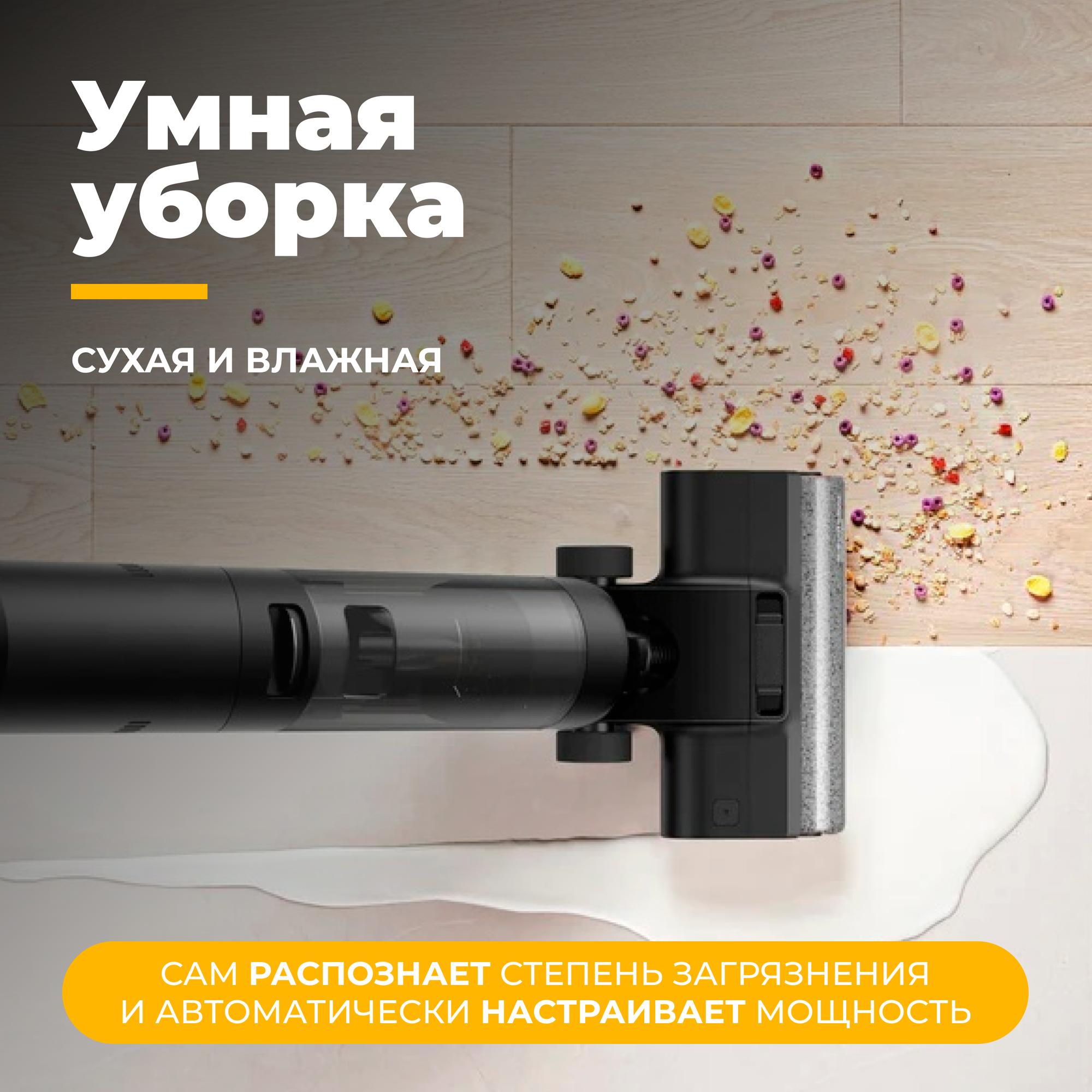 Liquid collection function, LED display, Wireless operation, Voice prompts in Russian, Two operating modes, Self-cleaning roller, Dry and wet cleaning, Smart control, self-cleaning