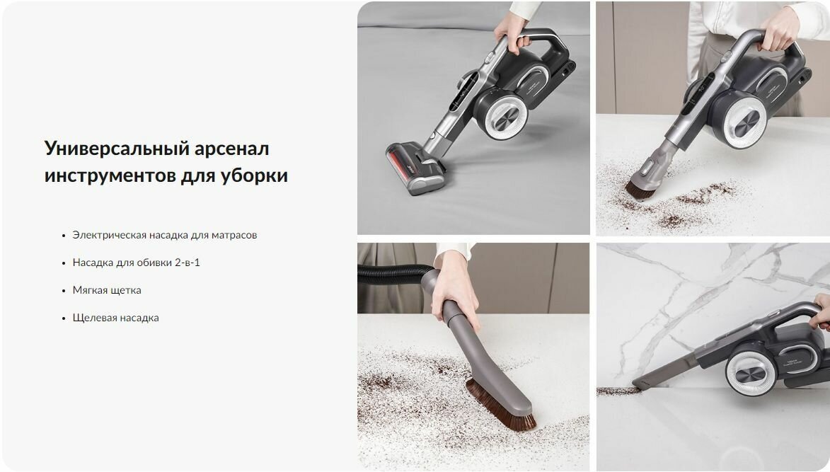 Ability to connect an electric brush, illumination of the cleaning area, removal of dust mites, illumination of the cleaning area, ability to connect an electric brush, removal of dust mites