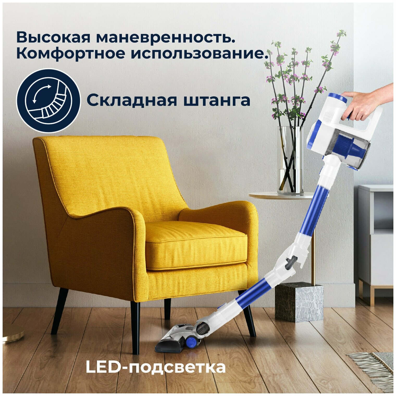 Possibility of connecting an electric brush, illumination of the cleaning area, battery charge indication