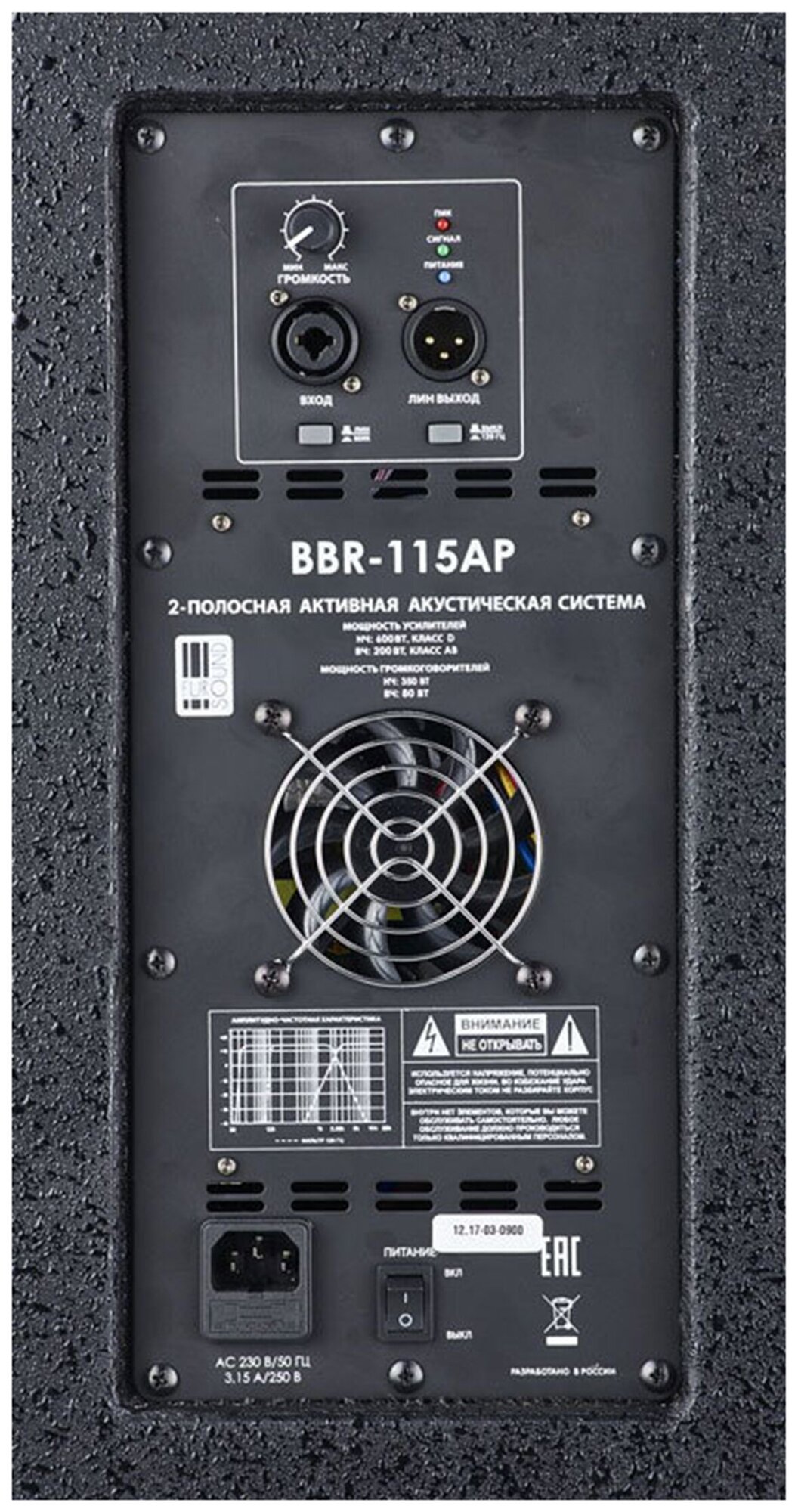 HF power - 200 W, LF - 600 W; balanced output; pole mount hole, 12 suspension points on the chassis