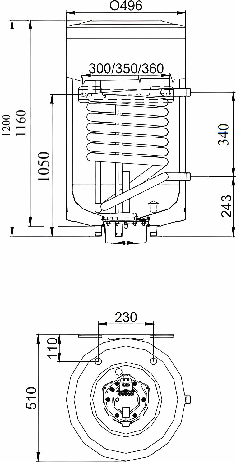 Type of water heater: accumulative, tank volume: 100 l, heating method: electric, installation: wall-mounted, position: vertical, connection: bottom, inner lining of the tank: glass-ceramic, mains voltage: 220, consumption