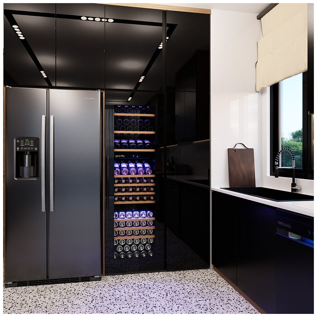 Telescopic pull-out shelves with cherry wood trims. Switchable interior lighting. Fan cooling system. Temperature selection for white and red wine. 5 fully retractable