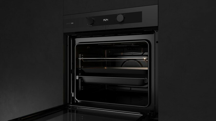 Fast heating, defrosting, timer, eco mode, cooling fan, built-in clock, display, oven door closer, chrome guides