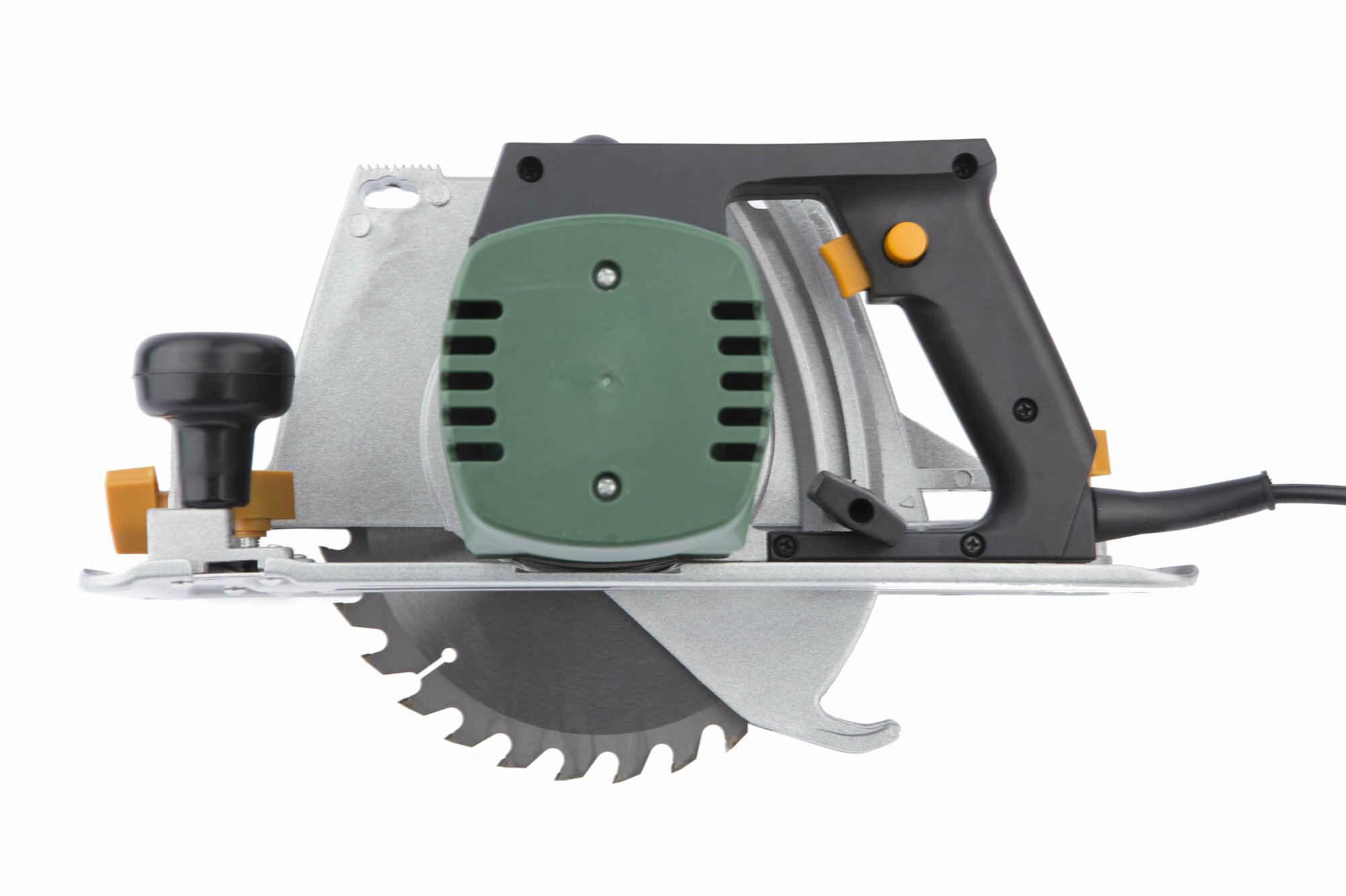 Cutting disc, parallel stop, hexagon wrench, clamping flange wrench, clamp 2 pcs., wedge knife with cover, set for fastening to the table, base plate, graphite brushes 2 pcs., chip removal pipe