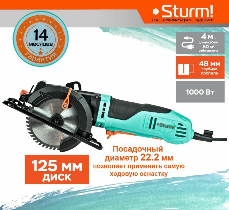 Blade diameter: 125 mm, cutting depth 90°: 48 mm, power supply: mains, Power W: 1000 W, weight: 3.30 kg, design features: anti-vibration system, ability to connect a vacuum cleaner, spindle lock