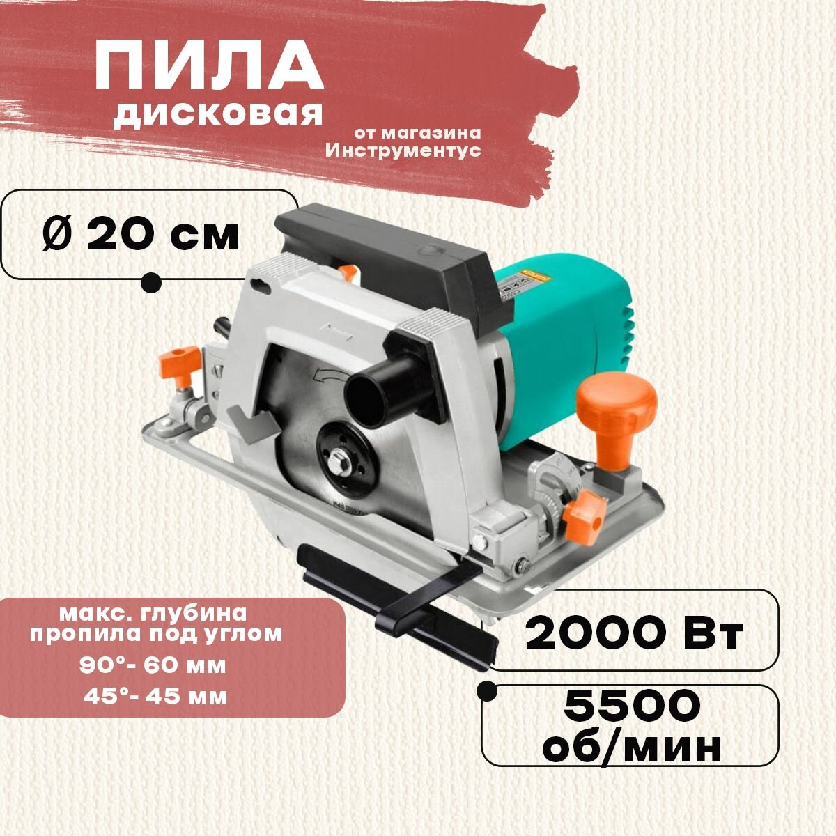 Circular saw, saw blade, protective cover, parallel guide, movable guide, riving knife, set of fastening to the workbench, bracket-2 pcs., bolt-2 pcs., nut-2 pcs., adapter for connecting a vacuum cleaner, f