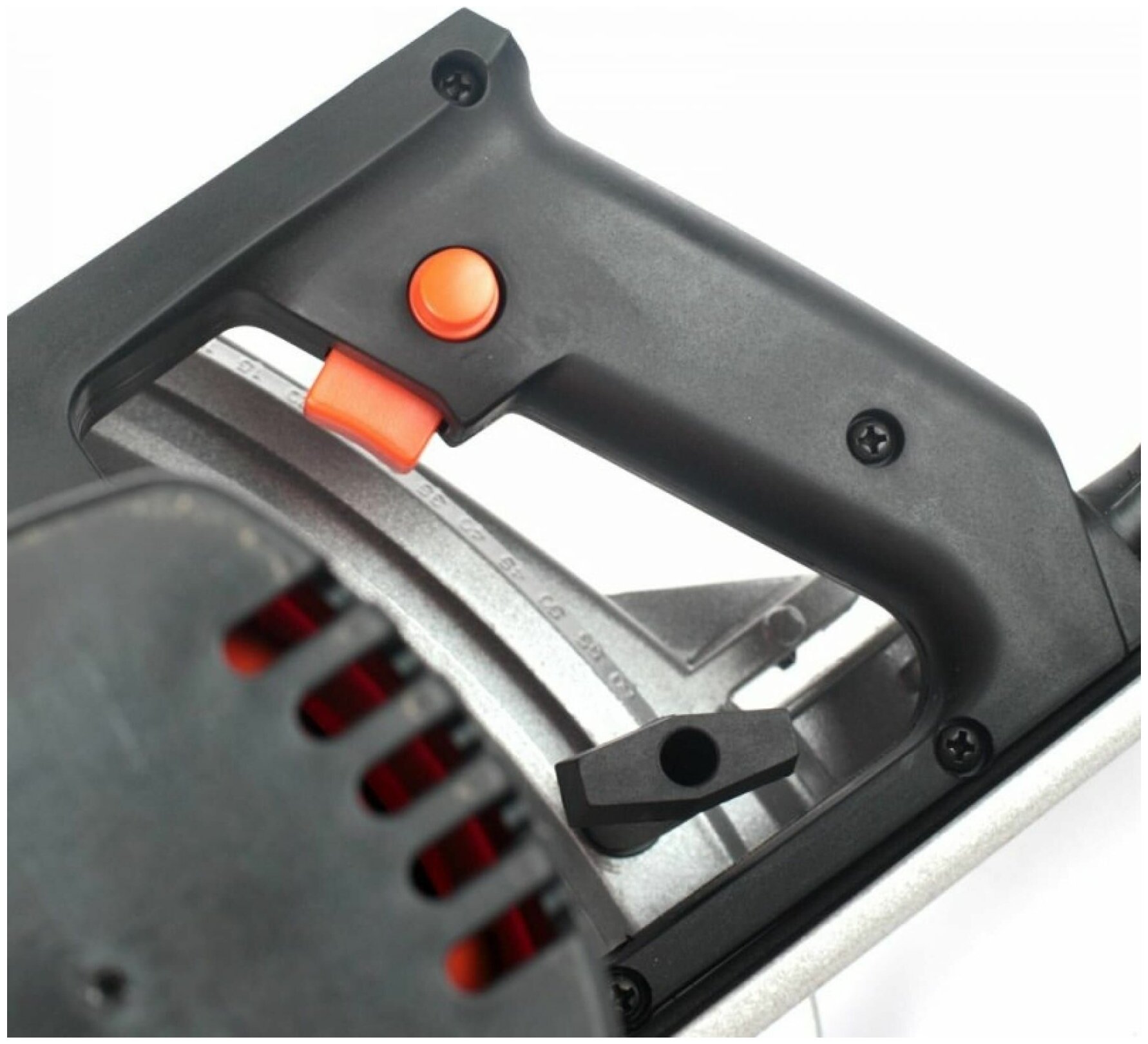 Adapter for connection to the extraction system or to the sawdust bag. Can be equipped with a guide. Shatter-free and precise cuts. Additional handle. The switch with protection. Minimum cutting depth