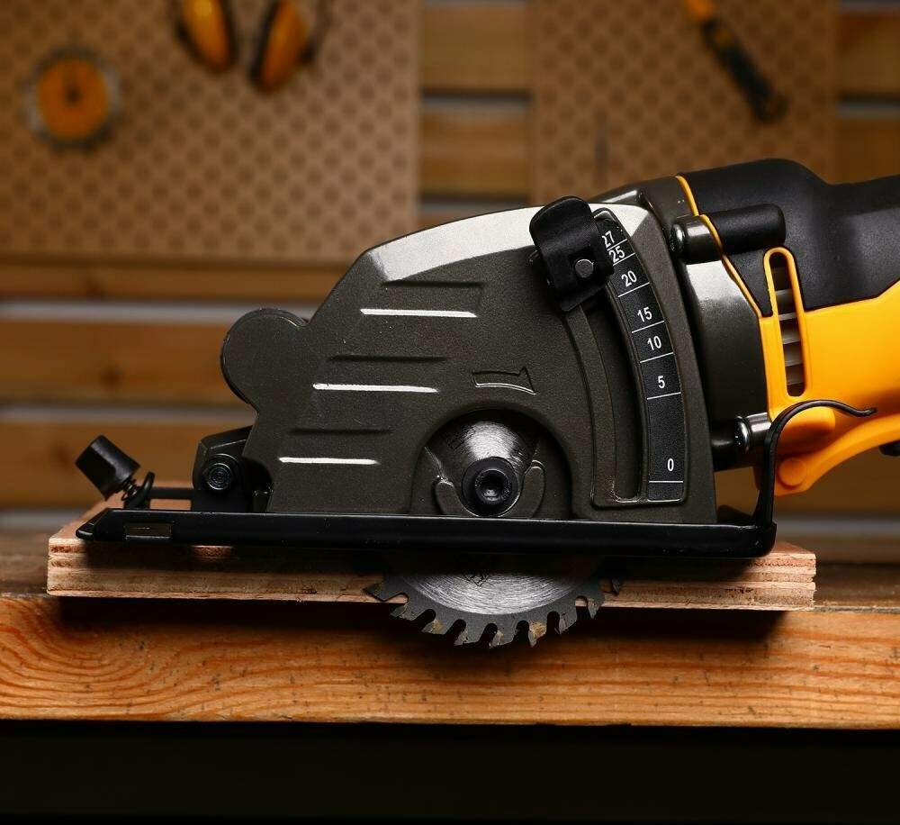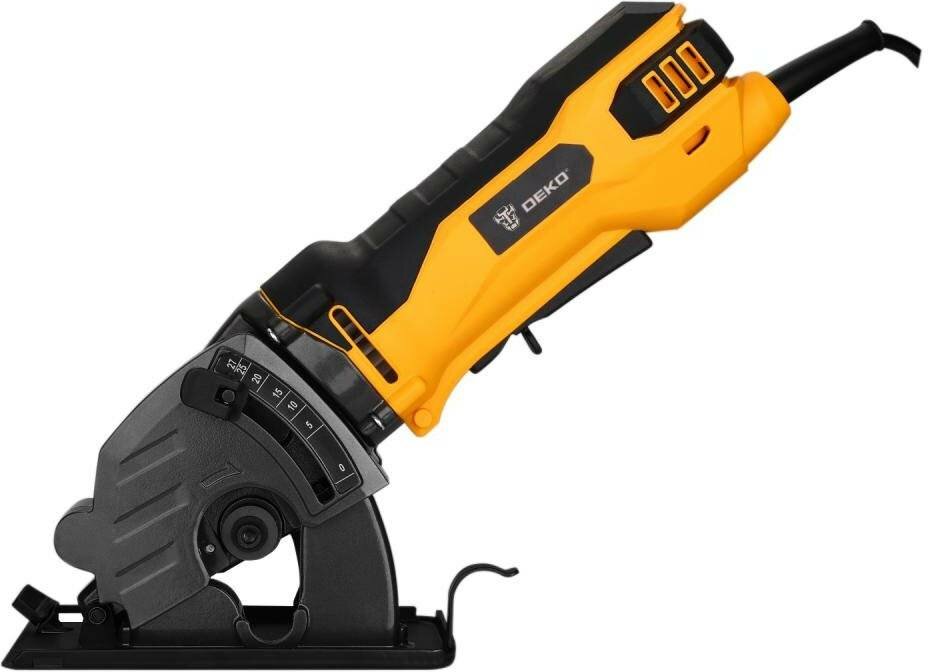 Adapter for connection to the extraction system or to the sawdust bag. Can be equipped with a guide. Shatter-free and precise cuts. Additional handle. The switch with protection. Minimum cutting depth