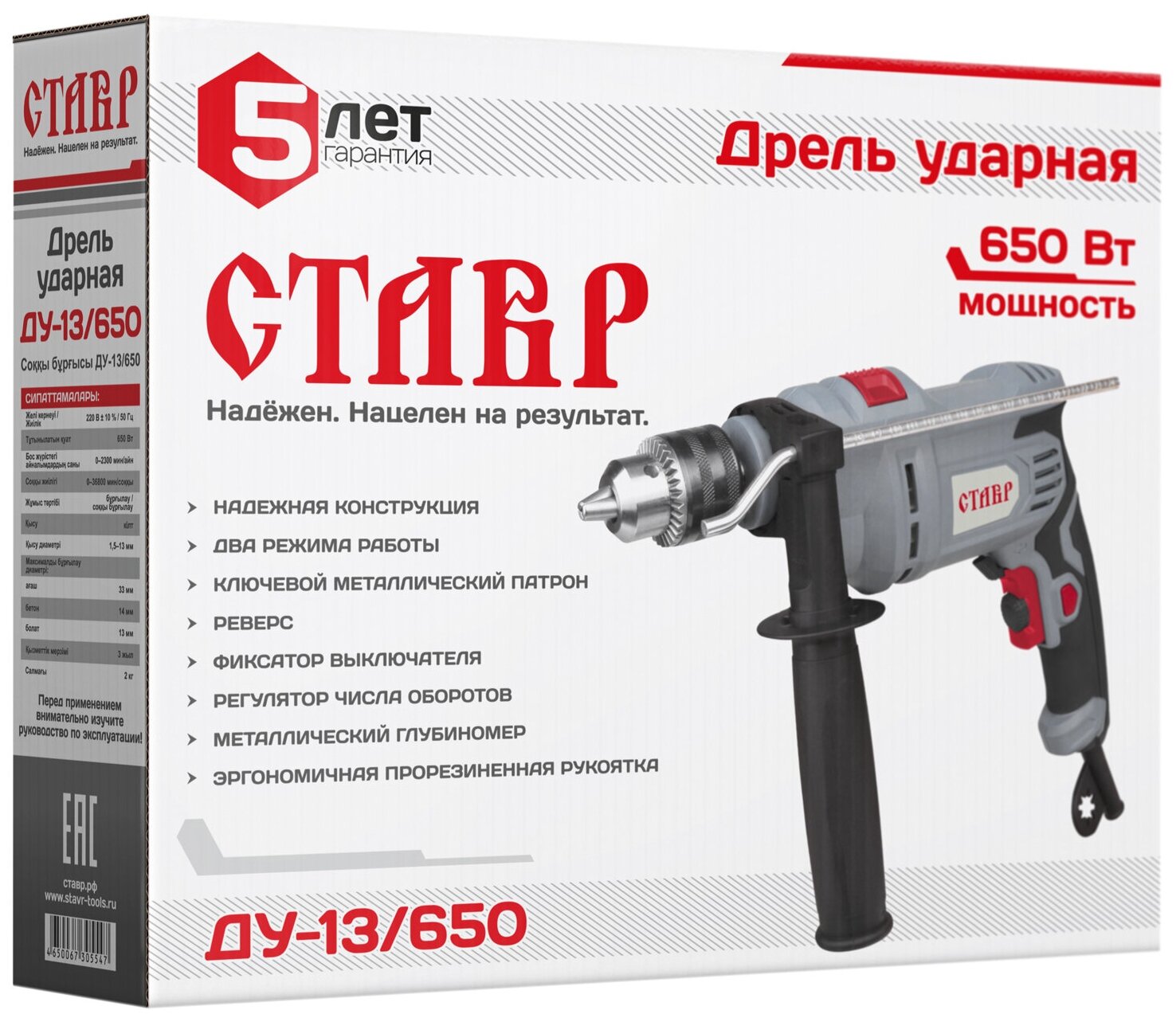 Type: drill, power type: mains, presence of impact for drill: impact, chuck type: key, functions: reverse, speed adjustment, Drilling, Drilling with impact, power consumption: 650 W, design features