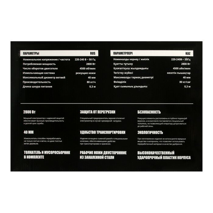 Motor type: electric, power: 2800 W, power: 3.81 hp, purpose: chopping branches and leaves, chopping system: cutting knives, branch diameter: 30–40 mm, capacity: from 50 to 100 kg/h, additional functions