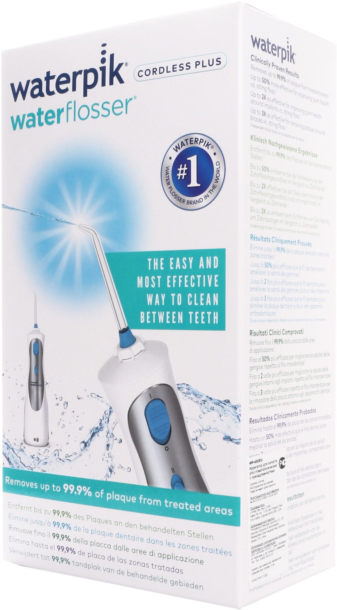 The main device is the Waterpik WP 450 E2 irrigator; standard nozzle - 1 piece; nozzle for cleaning the tongue and cheeks - 1 pc.; orthodontic nozzle - 1 pc.; implant nozzle - 1 pc.; Charger