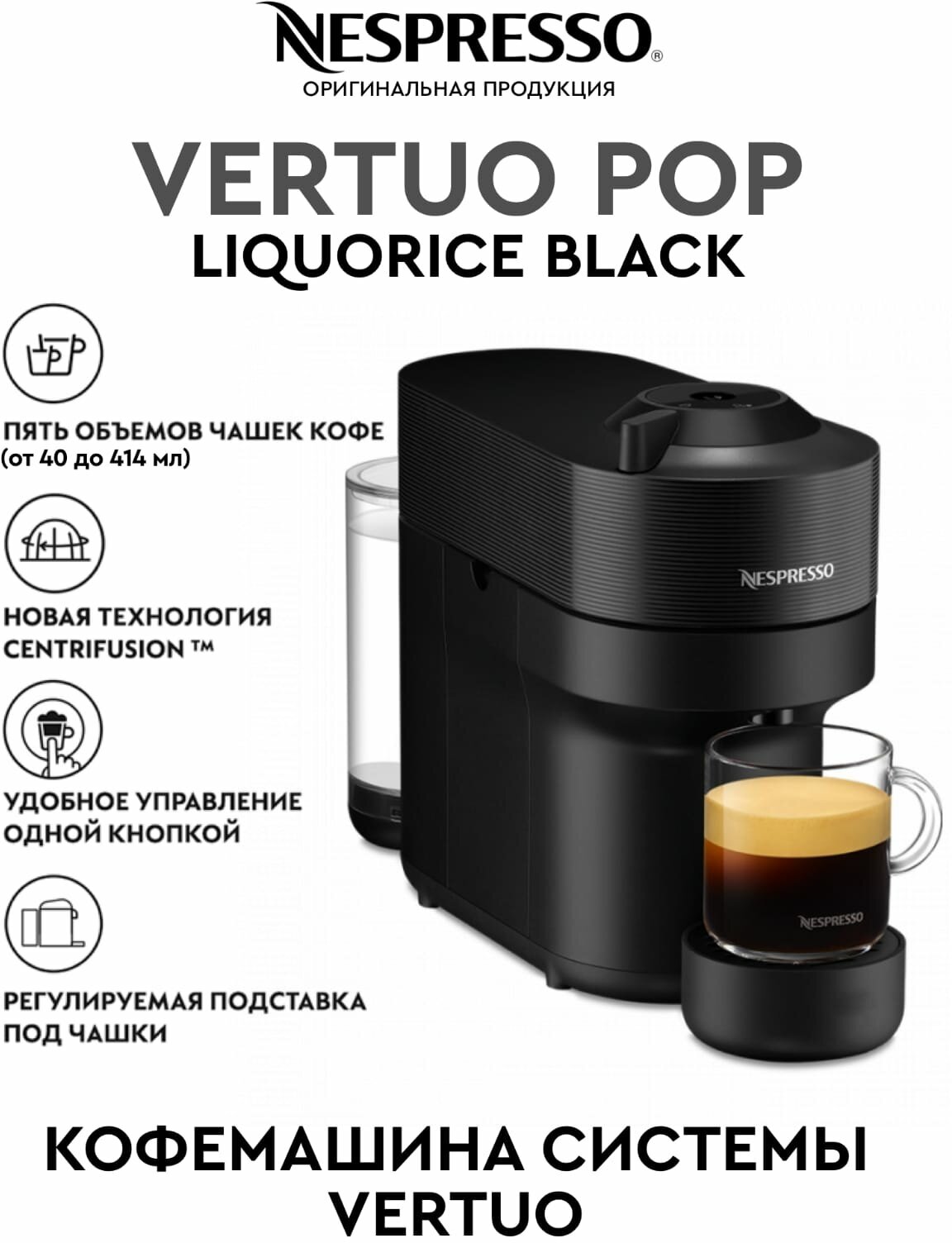 Device type: coffee machine, type: capsule, type of coffee used: capsules, type of drink: espresso, AmericanoDouble espressoCappuccinoLatteEspressoEspresso Lungo, type of capsules: Nespresso Vertuo, design features: indica