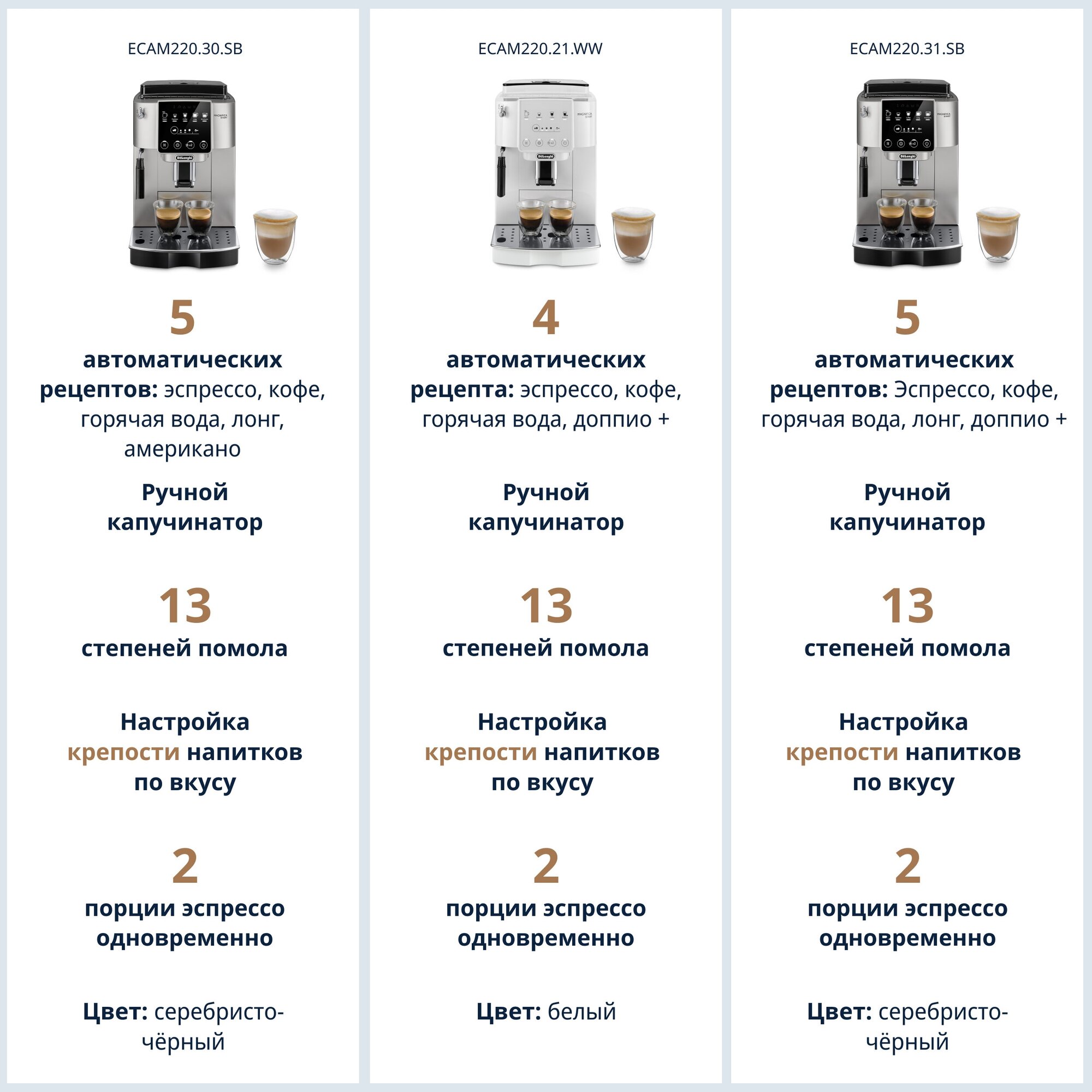Device type: coffee machine, type: automatic, type of coffee used: ground / bean, cappuccino preparation: manual, drink type: cappuccino, espresso, pump pressure: 15 bar, built-in coffee grinder, step adjustment