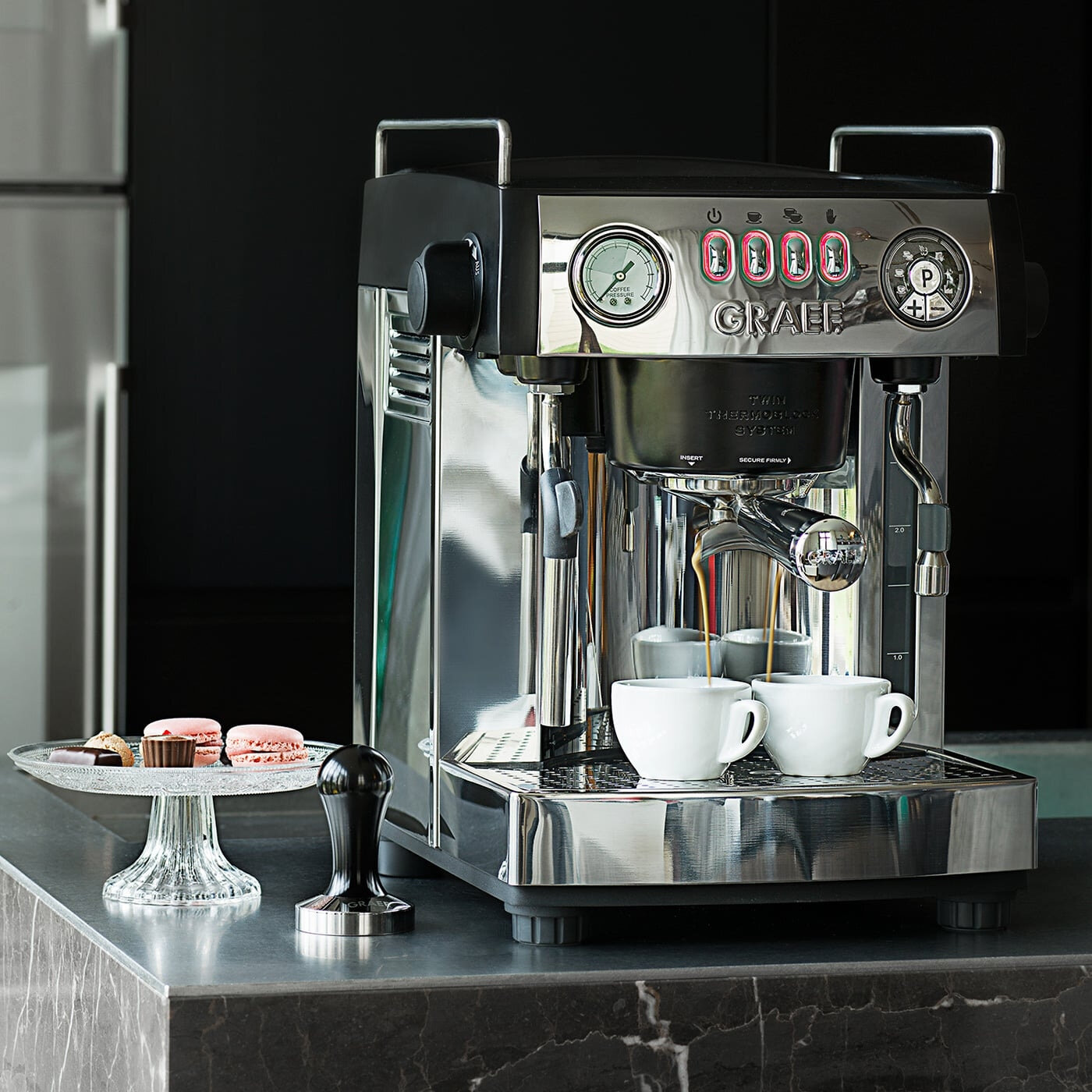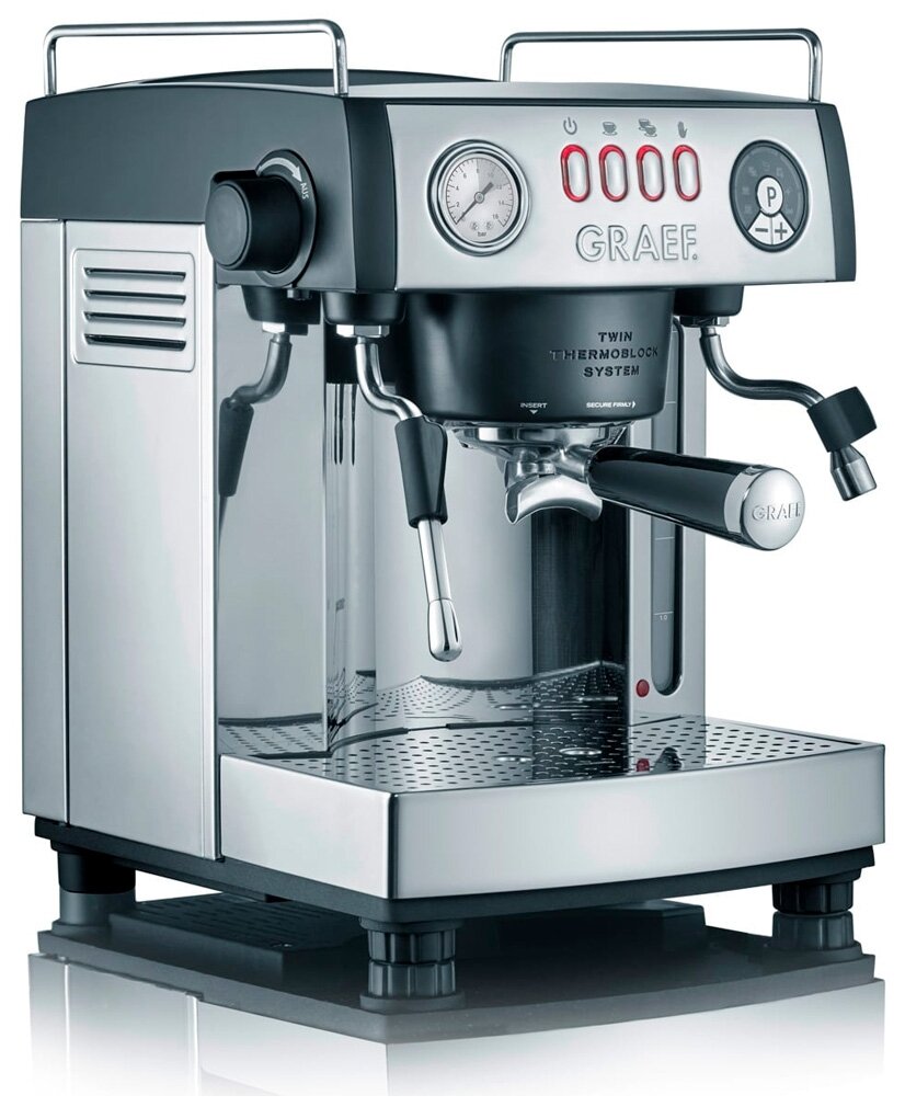 Automatic decalcification, pressure gauge, simultaneous preparation of two cups, cup heating