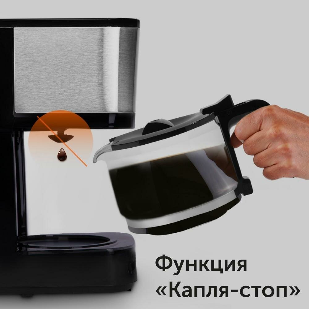 Device type: coffee maker, type: drip, type of coffee used: ground, drink type: Americano, volume: 0.60 l, additional functions: auto shut-off after preparing the drink, anti-drip system, features