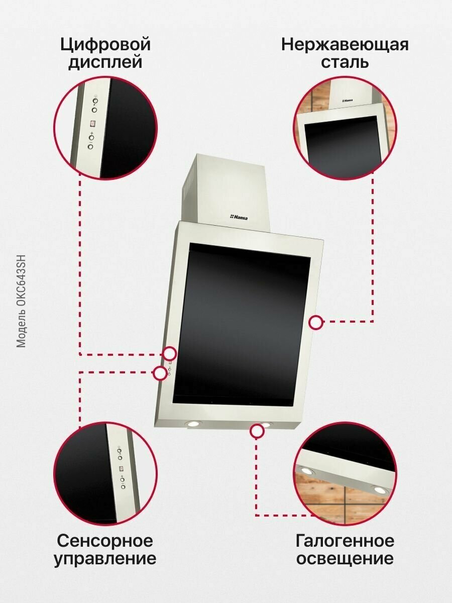 Form factor: inclined, width: 60 cm, depth: 50 cm, operating modes: exhaust / circulation, maximum productivity: 620 m³/hour, installation type: wall-mounted, filter: grease, lighting type: LED, maximum level
