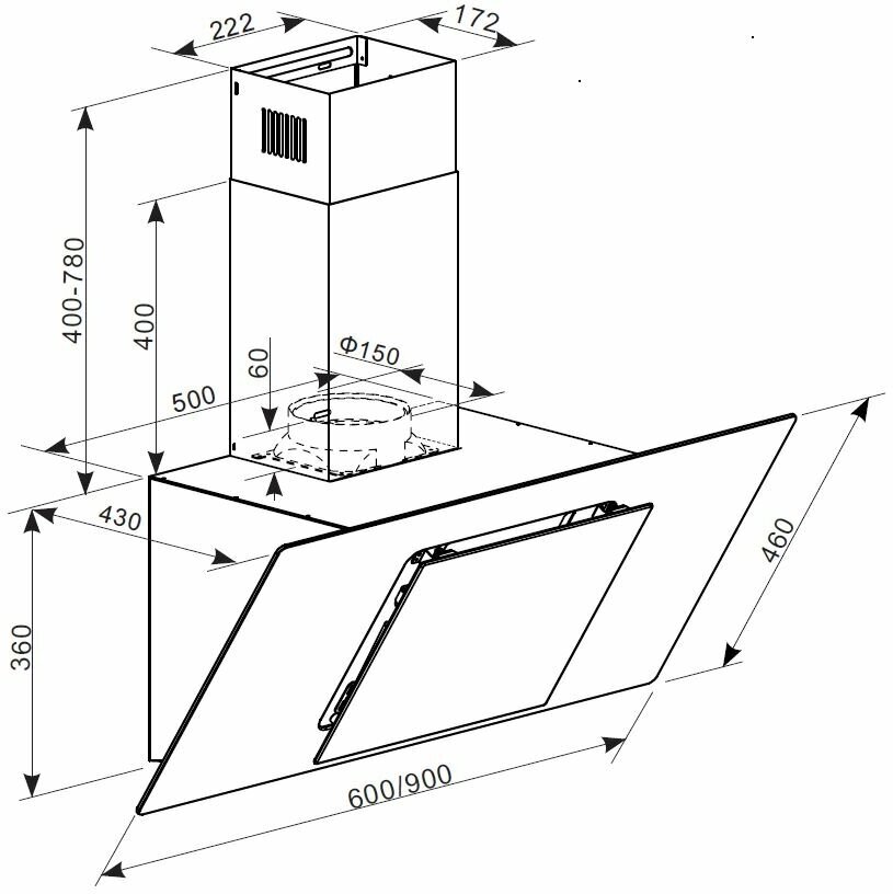 Form factor: inclined, width: 90 cm, operating modes: exhaust / circulation, maximum productivity: 700 m³/hour, installation type: wall-mounted, control type: electronic, lighting type: LED, maximum level