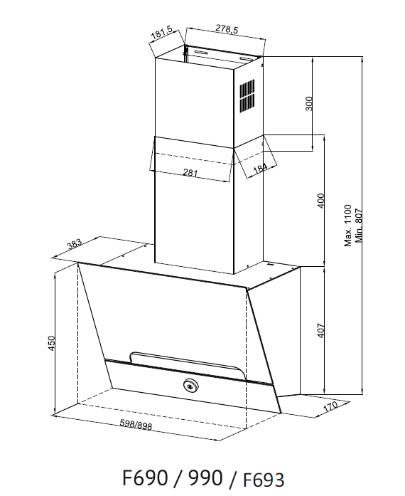 Form factor: inclined, width: 59.80 cm, depth: 38.30 cm, operating modes: exhaust / circulation, maximum productivity: 1300 m³/hour, installation type: wall-mounted, filter: grease + carbon, control type: electronic, type o