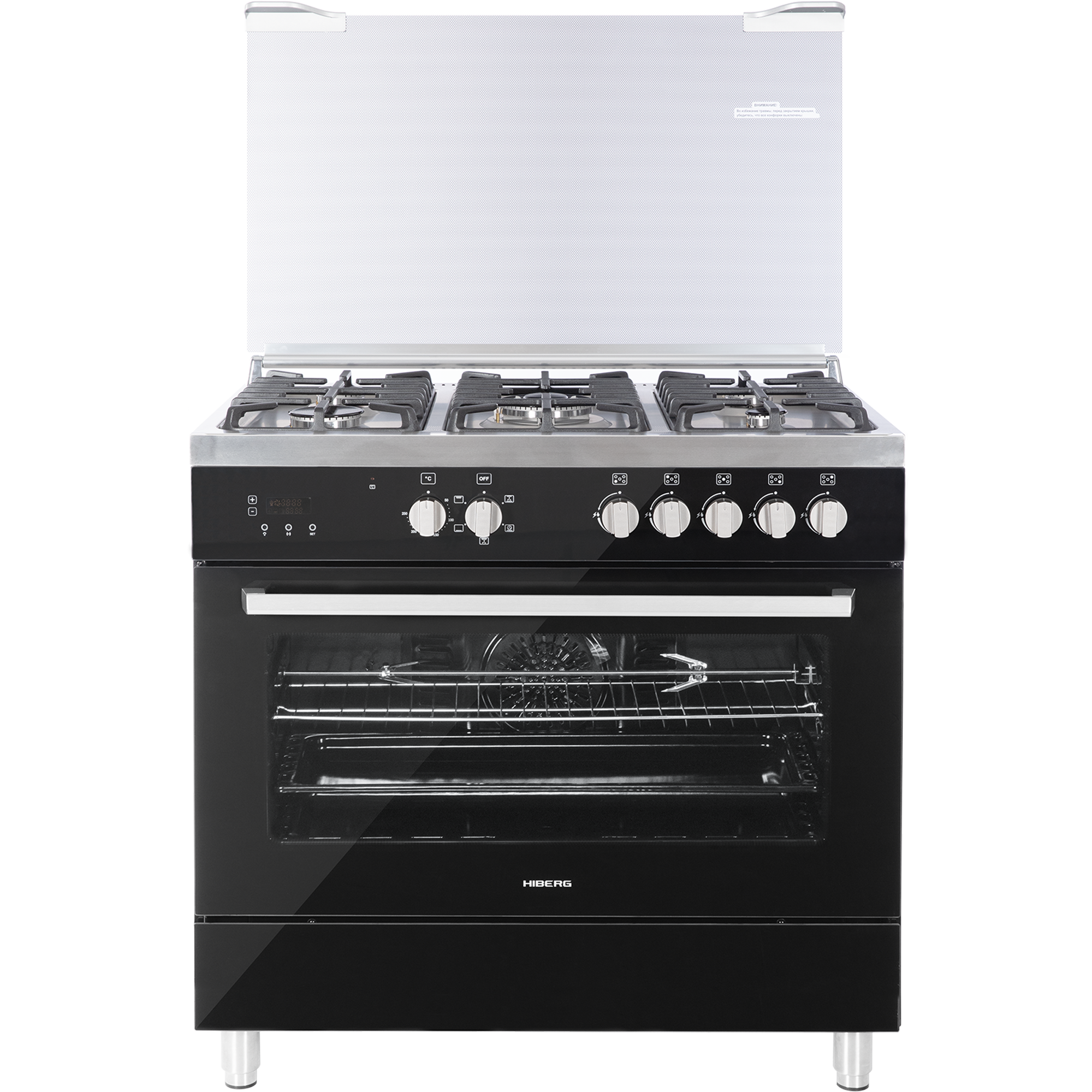 Spit, oven light, cast iron grates, utensil drawer, ring heating element in the oven, touch timer with display