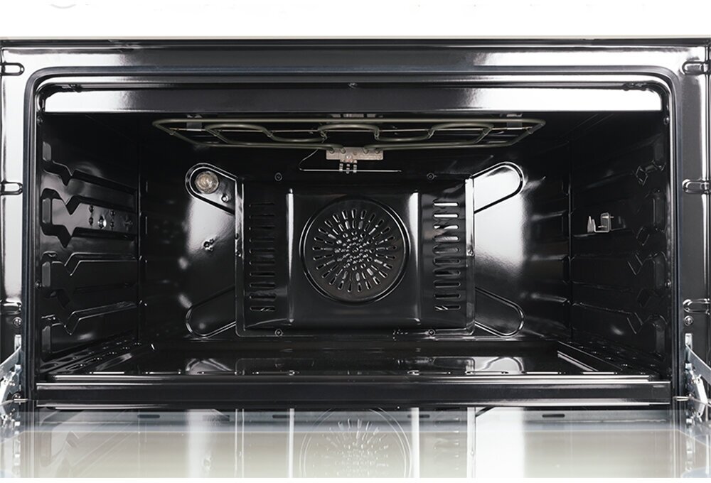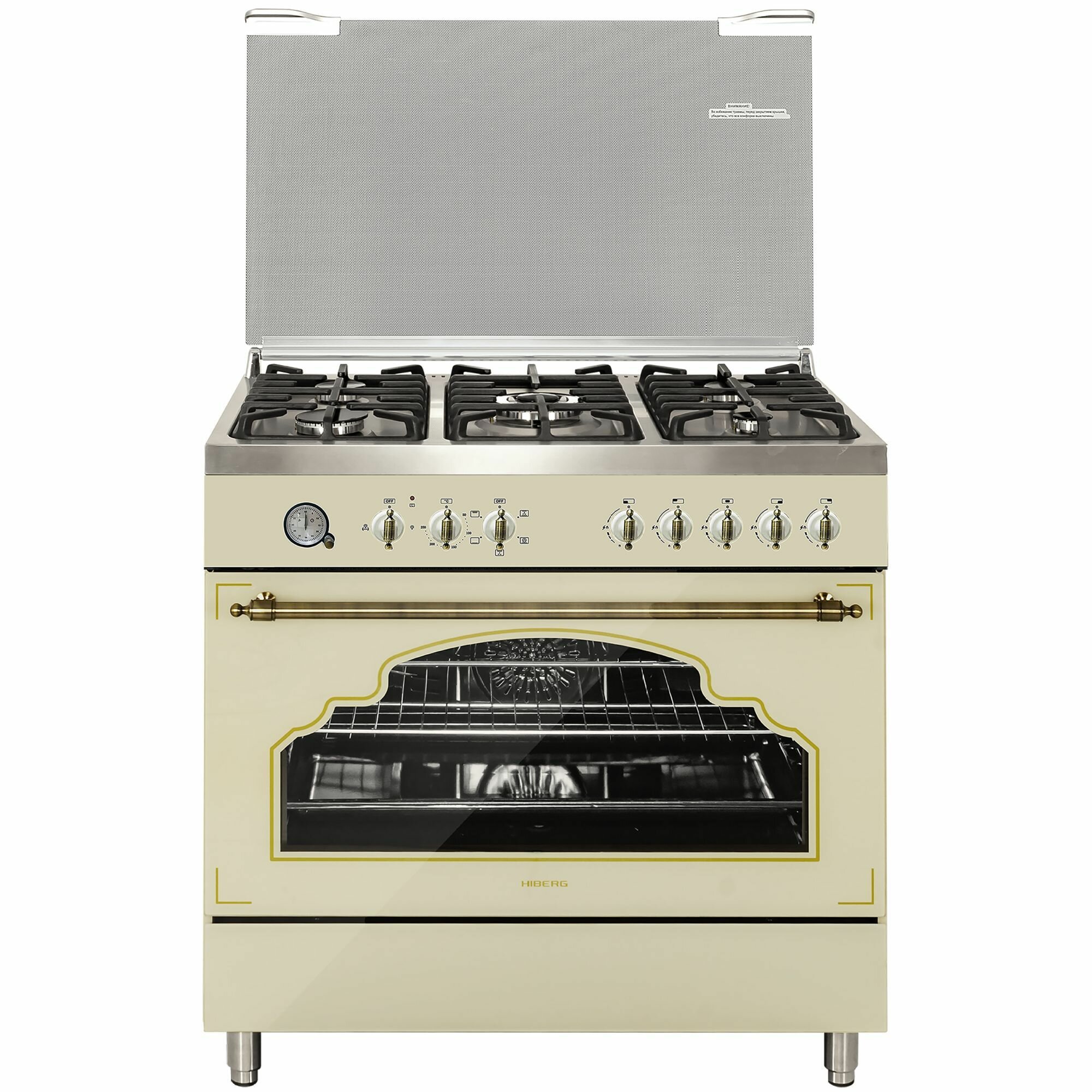 Spit, oven light, cast iron grates, utensil drawer, analog clock with timer, ring heating element in the oven