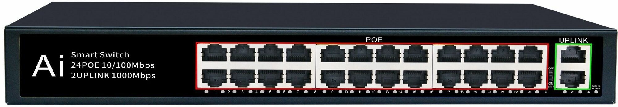 Rack-mountable, number of LAN ports: 26, base data transfer rate: 100 Mbps, network standards: IEEE 802.3af, IEEE 802.3at, switch management type: unmanaged, features: PoE support