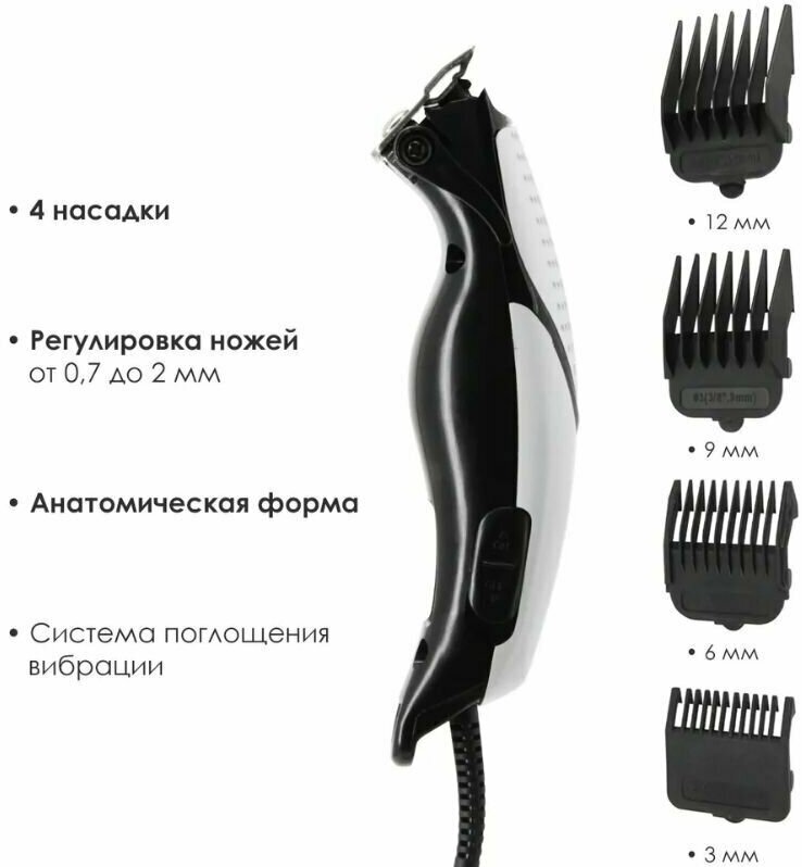 Purpose: for hair cutting, type: hair clipper, power supply: mains, minimum cutting length: 0.70 mm, maximum cutting length: 12 mm, blade material: stainless steel, length adjustment method: changing attachments and r