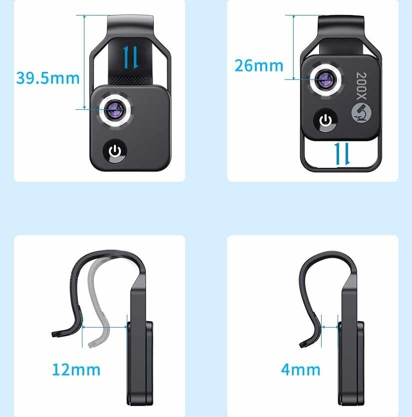 Type of microscope: portable, digital, USB connection USB microscope, mount for smartphone microscope for smartphone, maximum magnification: 200 x, type of illumination: LED