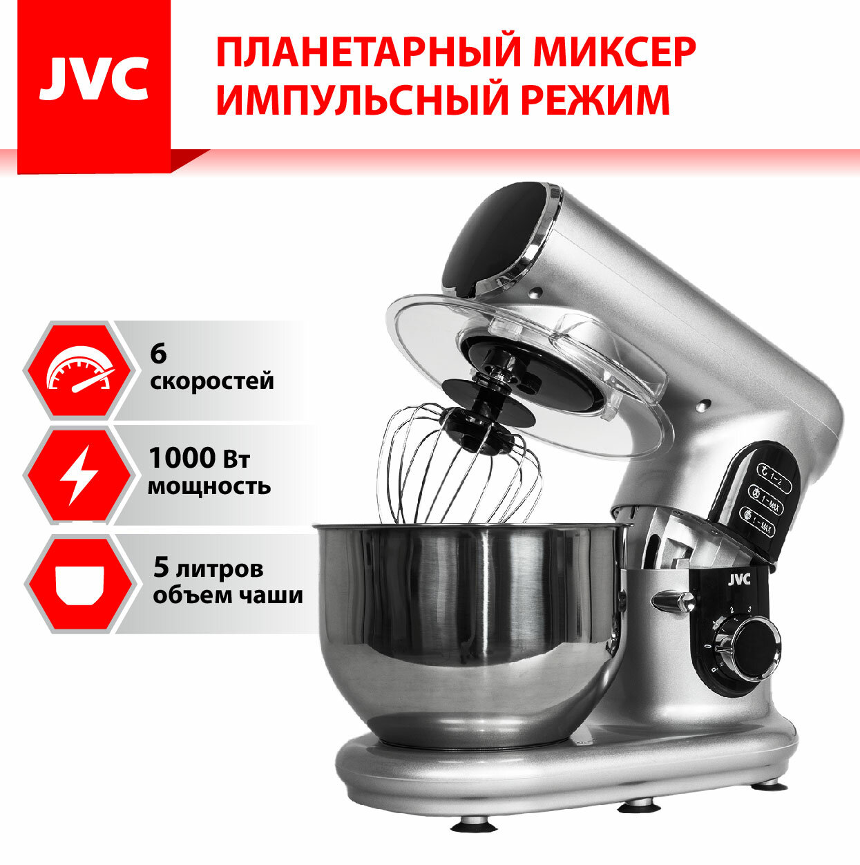 Type: planetary stationary, power: 1100 W, attachments: whisk for whipping, hooks for kneading dough, bowl material: stainless steel, bowl volume: 5 l, body material: plastic, additional modes: pulse �