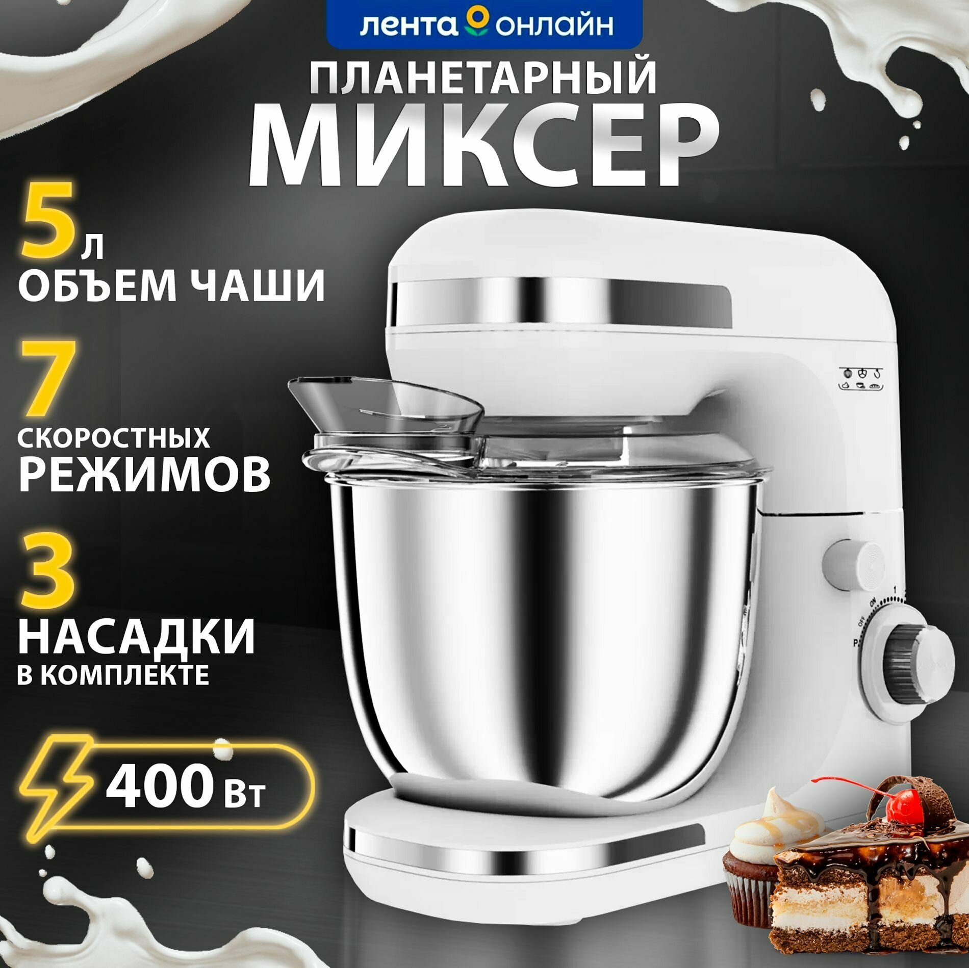 Type: planetary stationary, power: 400 W, attachments: whisk for whipping, hooks for kneading dough, bowl material: stainless steel, body material: metal, plastic, number of speeds: 7
