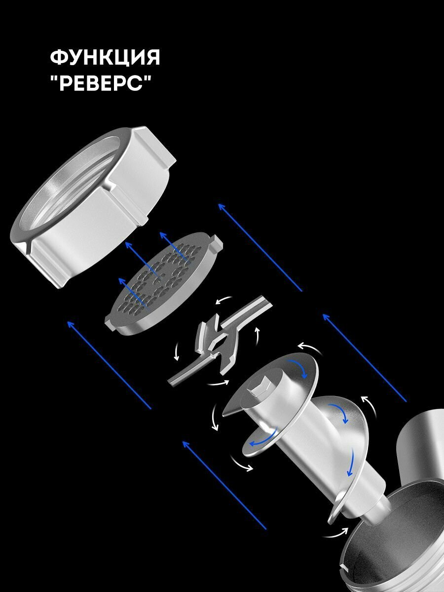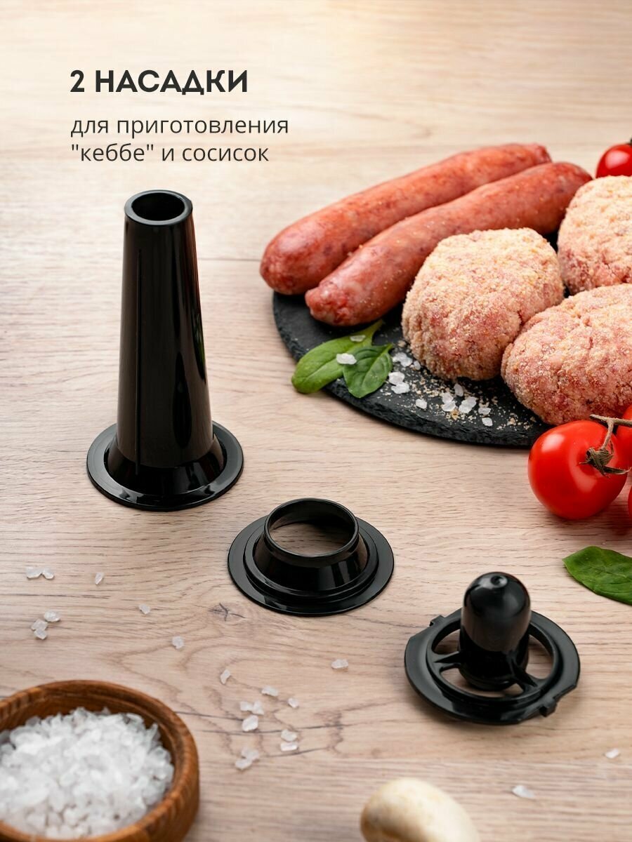 Rated power: 300 W, attachments: mince disk, kebbe attachment, juicer, body material: plastic/metal, reverse system, productivity: 1.30 kg/min, features: rubberized legs, maximum time