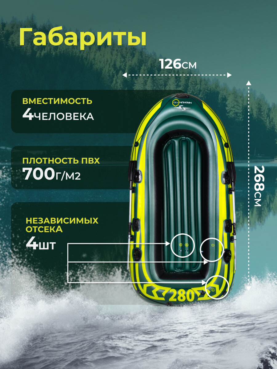 Type: rowing, number of seats: 4, bottom type: inflatable, floor type: inflatable, boat material: unreinforced PVC, load capacity: 290 kg, boat length: 280 cm, boat width: 126 cm, weight: 8.60 kg, transom: none
