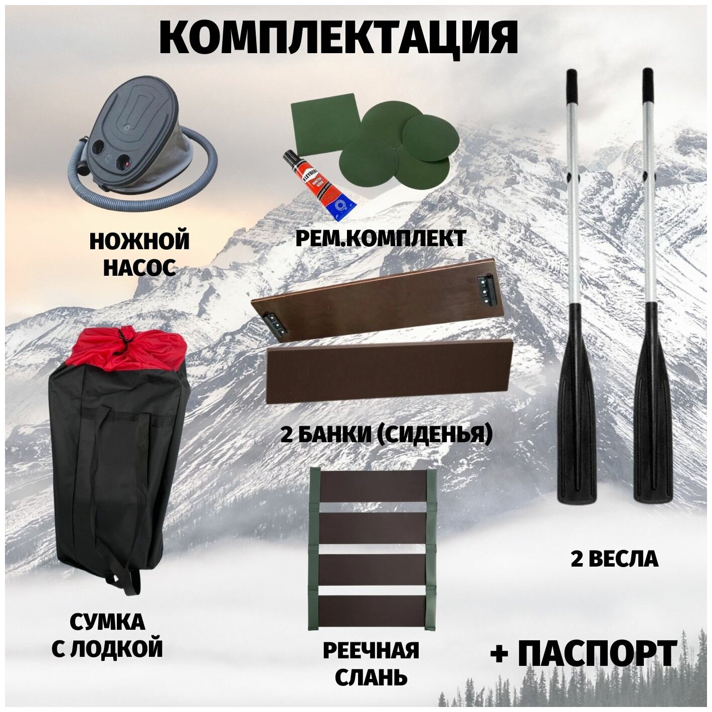 Two-chamber boat - 1 pc., passport - 1 pc., oars - 2 pcs., foot pump - 1 pc., repair kit - 1 pc., seat cans - 2 pcs., boat bag - 1 pc., slatted sling - 1 PC.