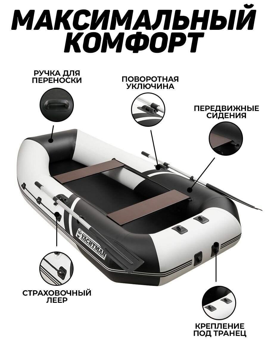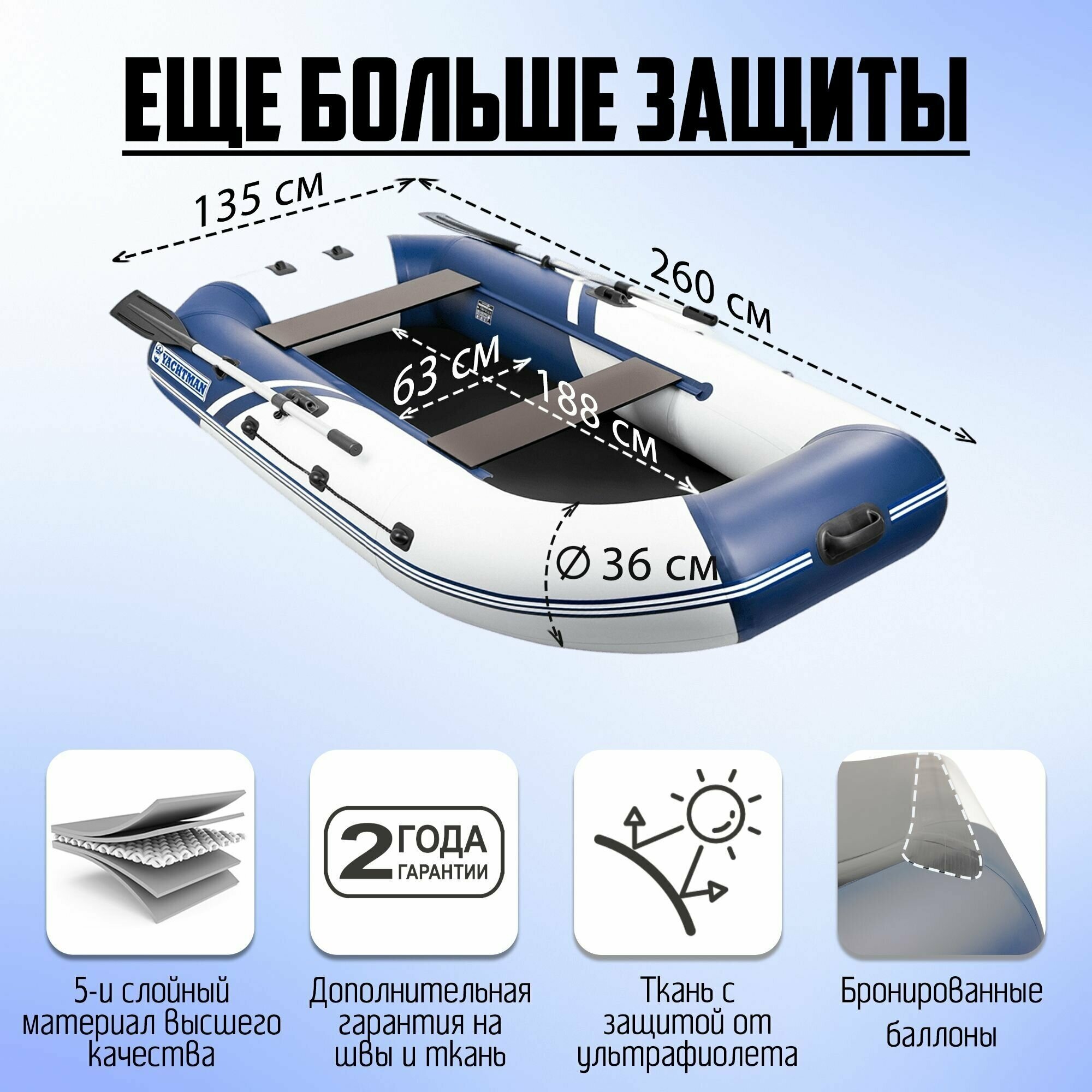 Type: motor rowing, number of seats: 2, bottom type: non-inflatable, floor type: not applicable, boat material: reinforced PVC, load capacity: 220 kg, boat length: 260 cm, boat width: 135 cm, weight: 13 kg, maximum motor power