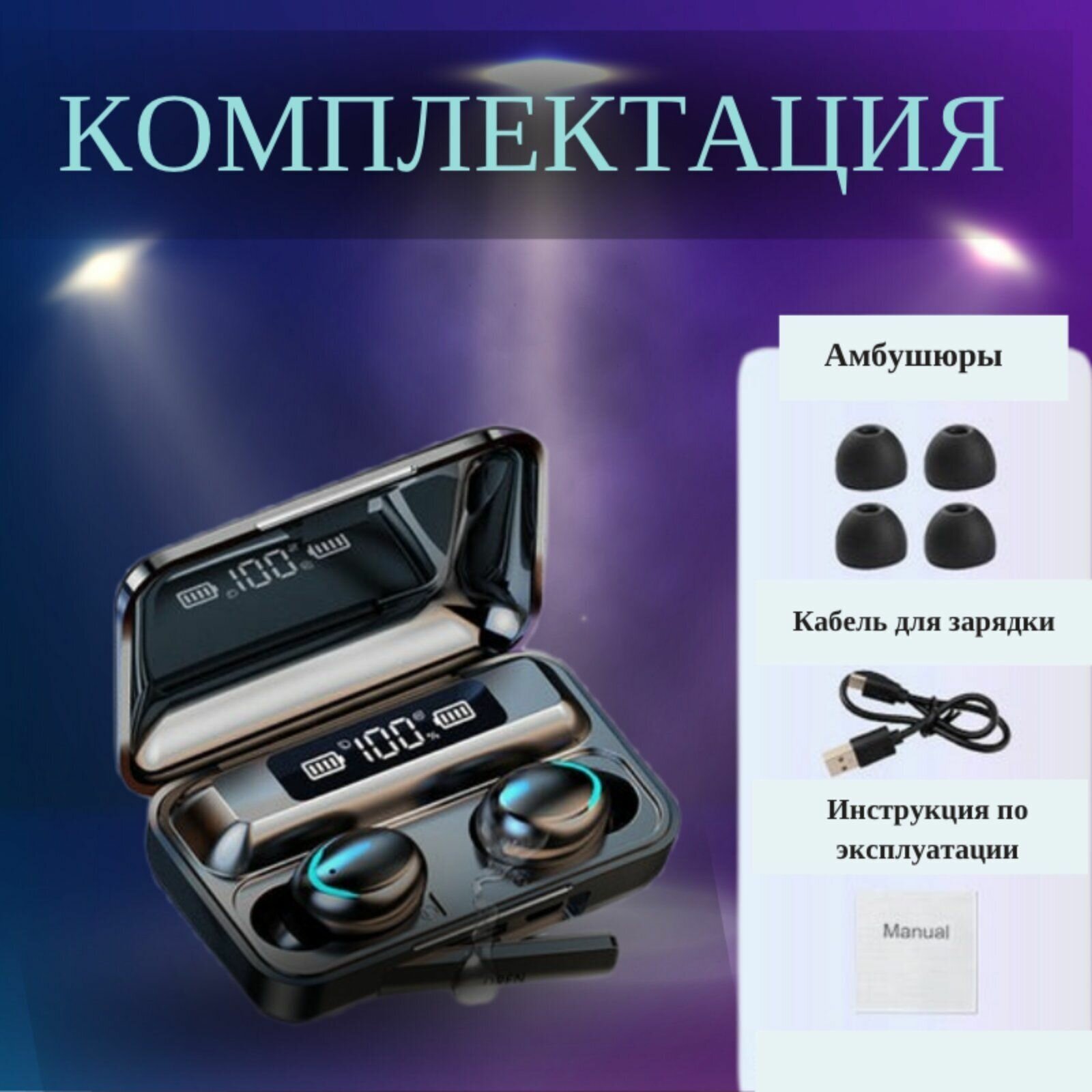 Wireless headphones with built-in microphone - 2 pcs., replaceable silicone ear pads - 2 pcs. x 3 sets, instructions, cable, PowerBank case with charging function for other devices