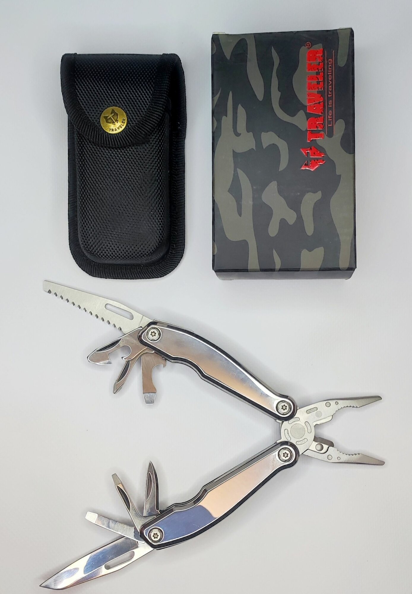 Can opener, wire cutters, knife, screwdriver, bottle opener, pliers, saw