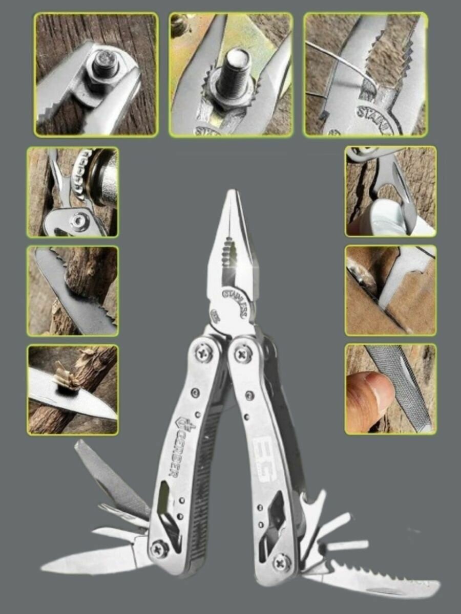 Nut grip, can opener, wire cutters, file, screwdriver, bottle opener, pliers, saw, replacement bits, awl/punch