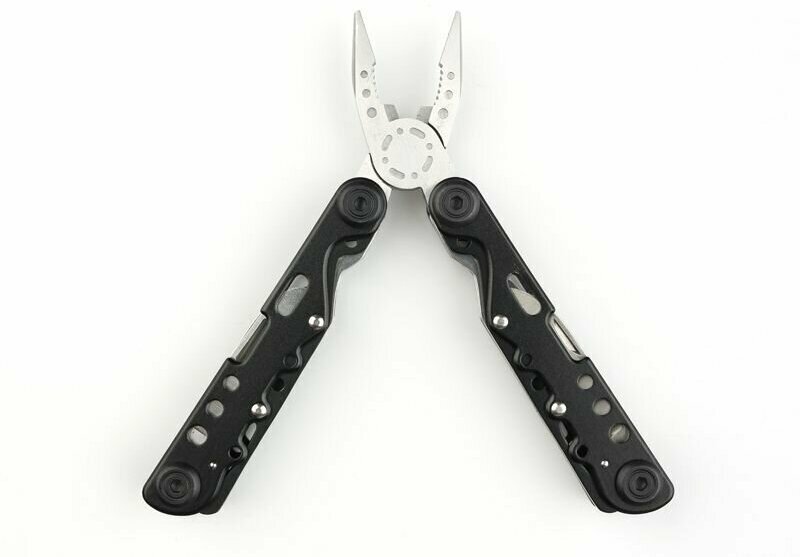 Nut grip, can opener, wire cutters, file, knife, screwdriver, bottle opener, saw, pliers