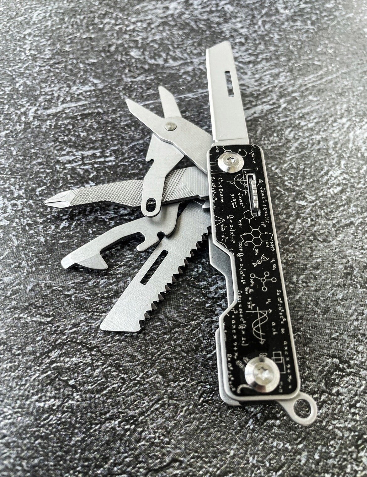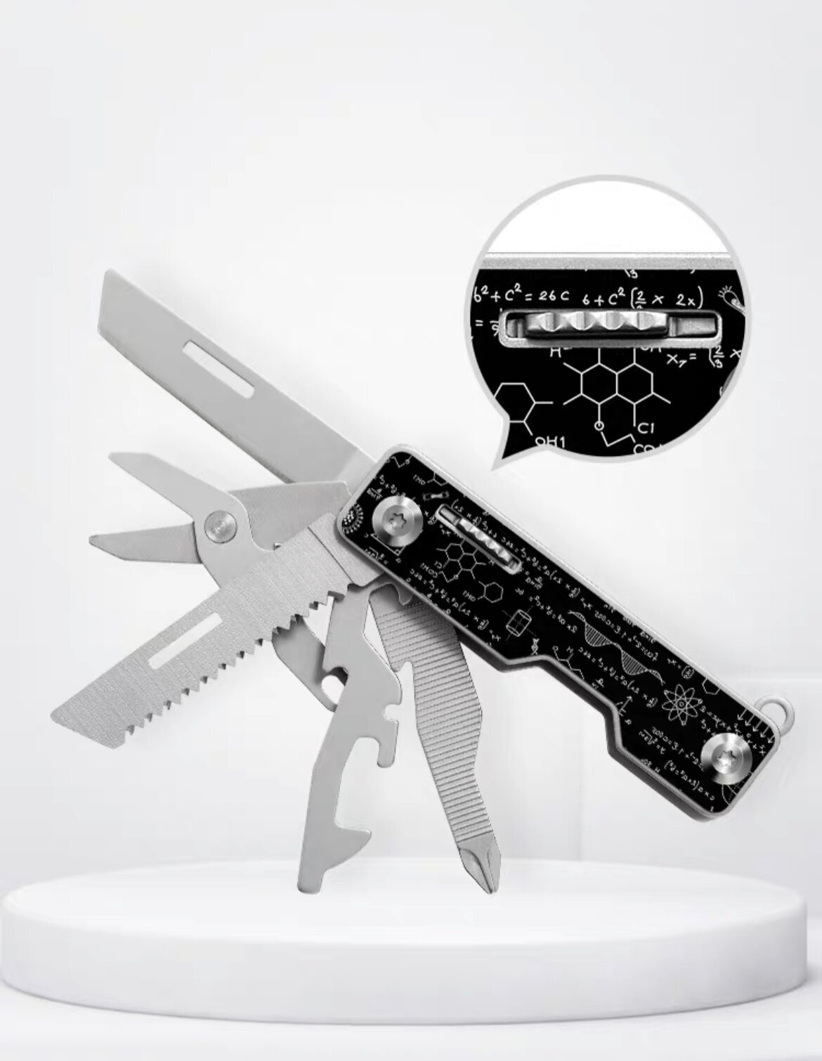 Can opener, knife, scissors, screwdriver, bottle opener, saw, nail file