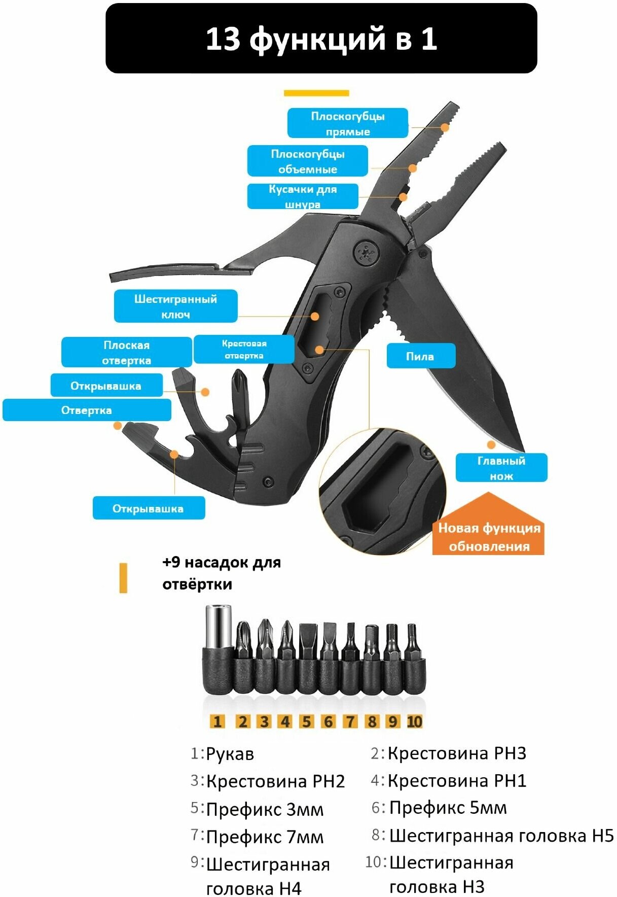 Number of function tools: 13; number of bits: 9 pcs; lock type: liner lock