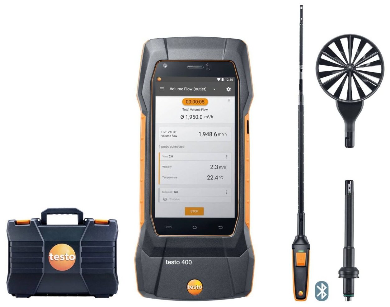 Universal measuring instrument, heated wire probe with Bluetooth® handle and telescopic handle, Ø 100 mm vane probe, high-precision humidity/temperature probe, 90° angle adapter, carrying case