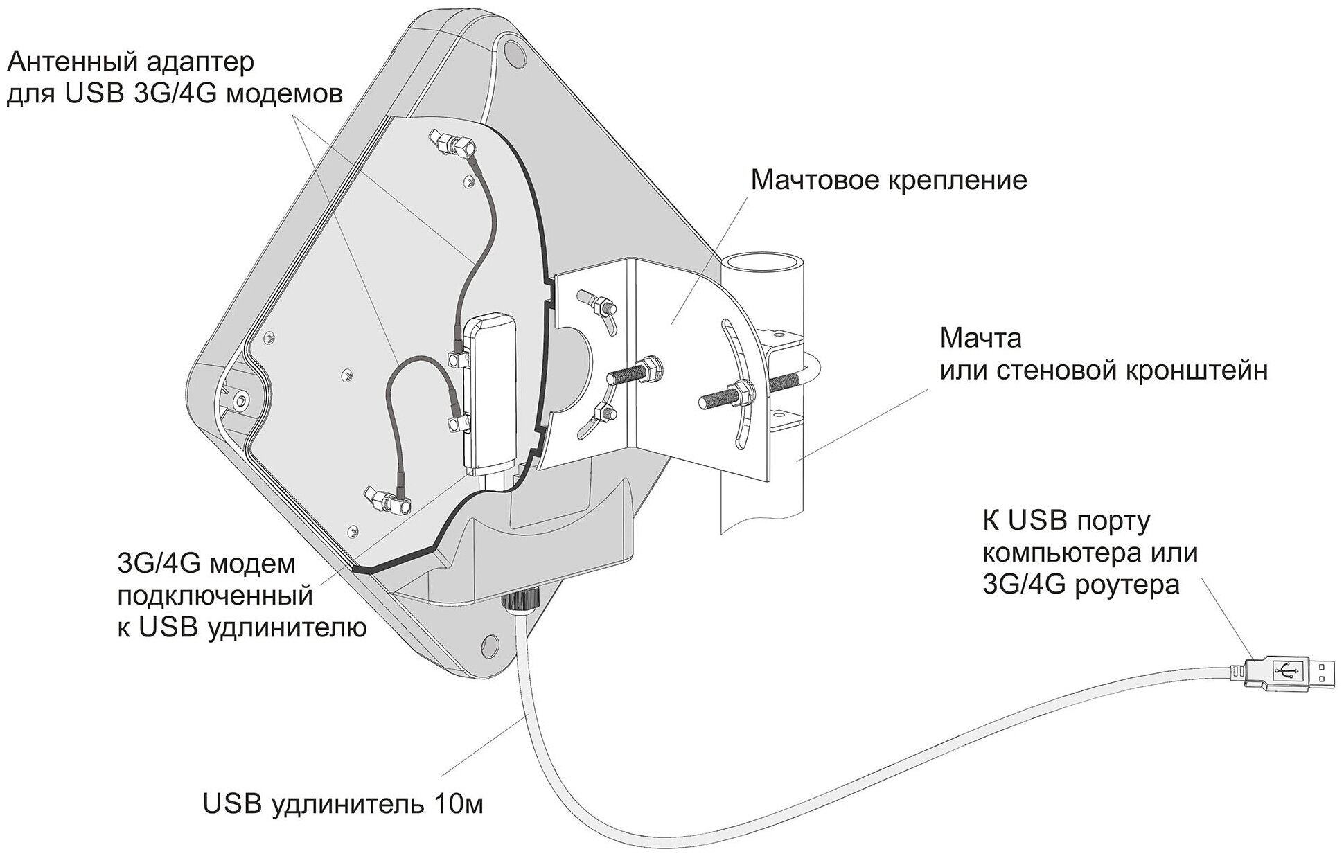 -Panel MiMo antenna 2х18dBi KAA18-1700/2700; -Two cable assemblies made of copper cable RG-6U 10 meters long for outdoor installation; -Two F-CRC9 adapters for connecting to a modem; -Wall bracket 0.3m for mounting the antenna; -University
