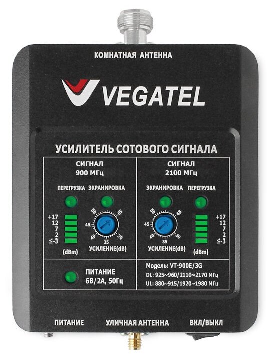 Equipment: Repeater VEGATEL VT-900E/3G-kit LED 1 pc., indoor antenna VEGATEL ANT-700/2700-PI 1 pc., all-weather antenna VEGATEL ANT-900/2700-PO 1 pc., built-in cable assembly 5D/FB SMA- male 10 m, power supply 1 pc., fixing kit for antenna 1 pc.
