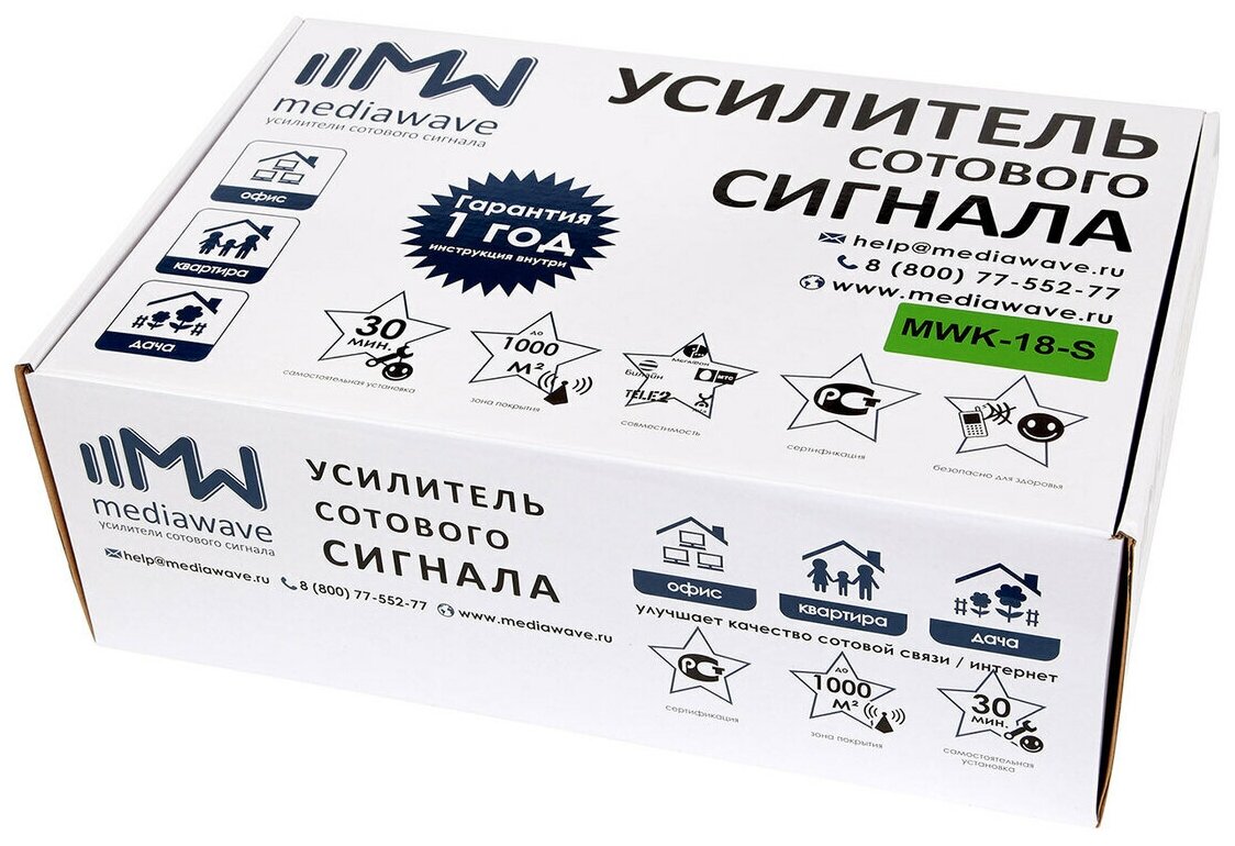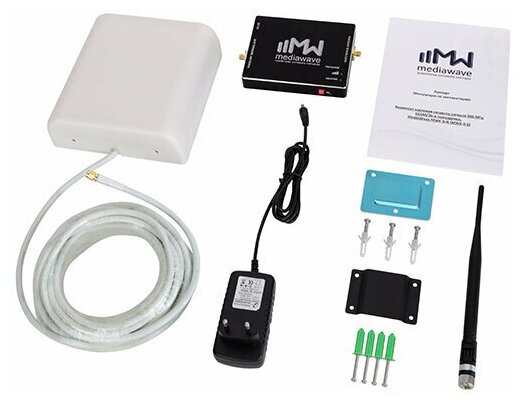 1800 MHz repeater MediaWave MWS-D-B15, power adapter, outdoor panel GSM/4G-LTE antenna with 10 m cable, indoor GSM/4G-LTE whip antenna, installation and operation manual, repeater and antenna mounting kit