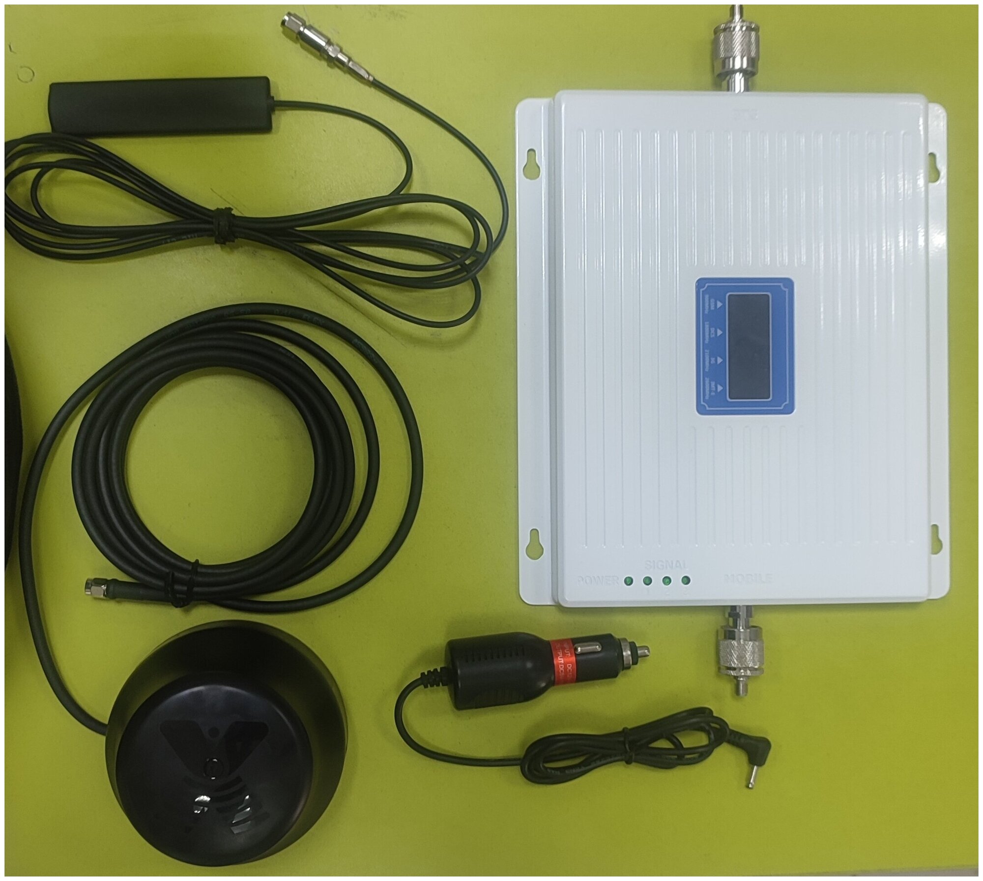 Repeater/amplifier, outdoor antenna, indoor antenna, cigarette lighter adapter, instruction English.