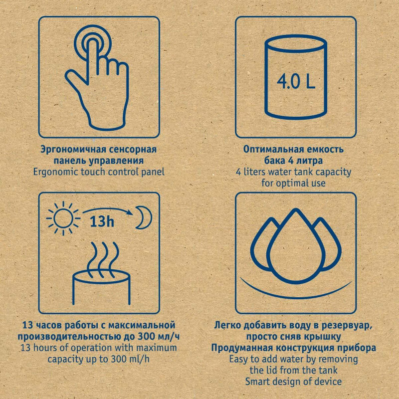 Type: air humidifier, room area: 25 m², type of humidifier: ultrasonic, additional functions: aromatization, water tank volume: 4 l, water flow: 300 ml/h, installation: floor, desktop, features: