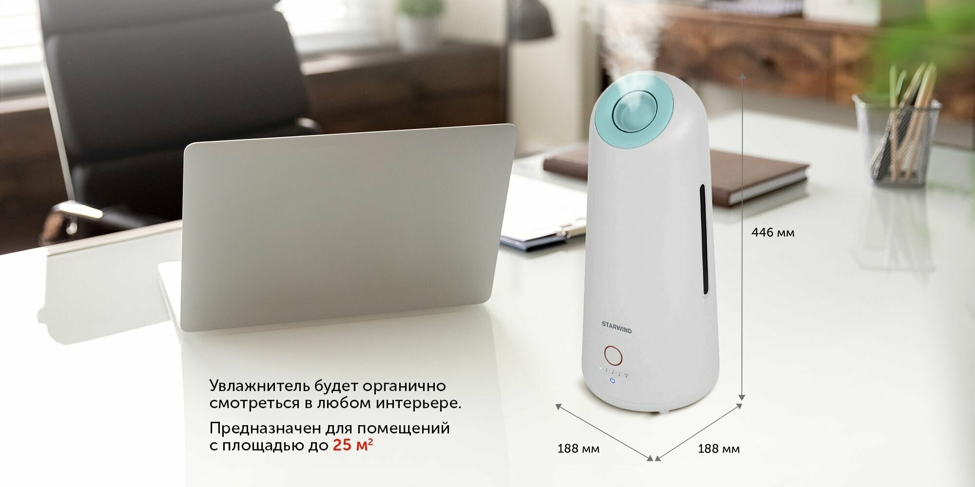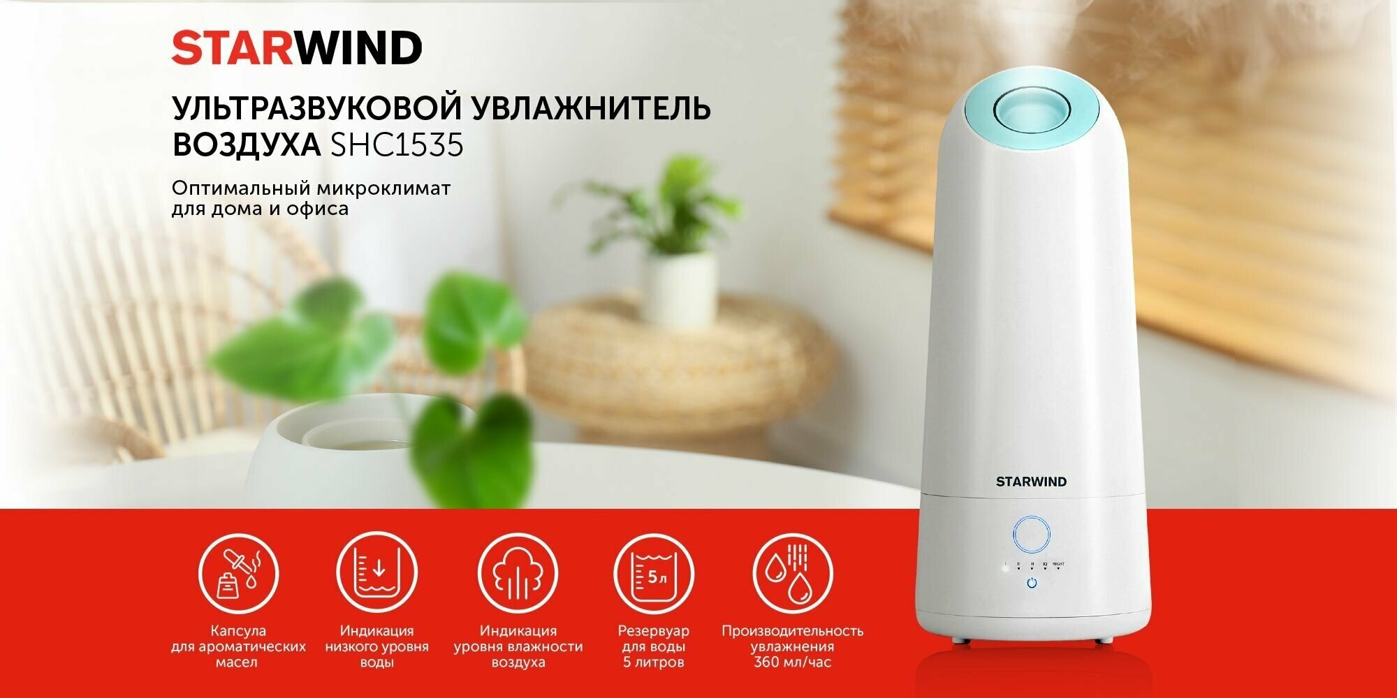 Type: air humidifier, room area: 25 m², humidifier type: ultrasonic, additional functions: aromatization, filters: pre-cleaning, humidifying, water tank volume: 5 l, water consumption: 360 ml/h,