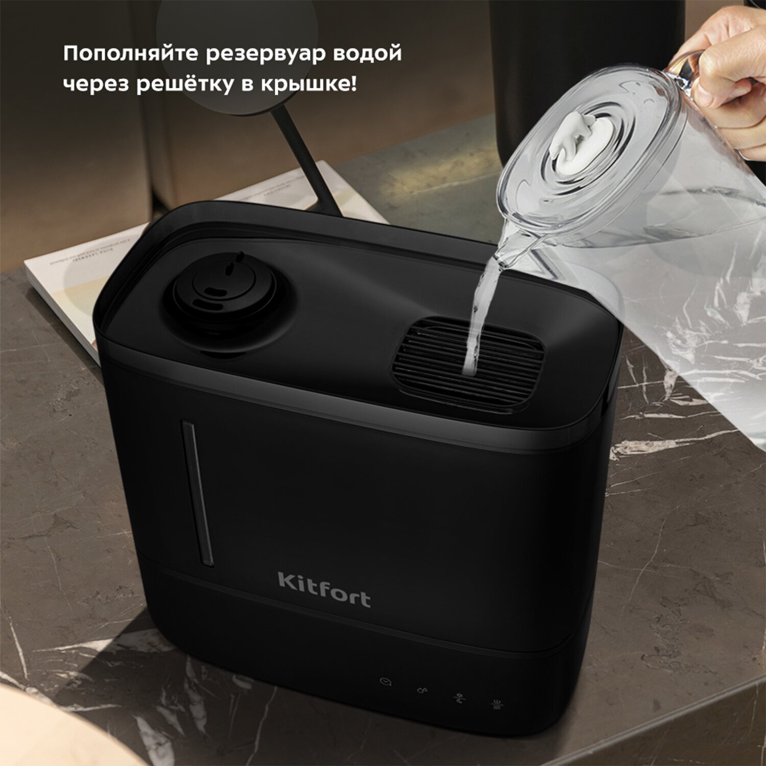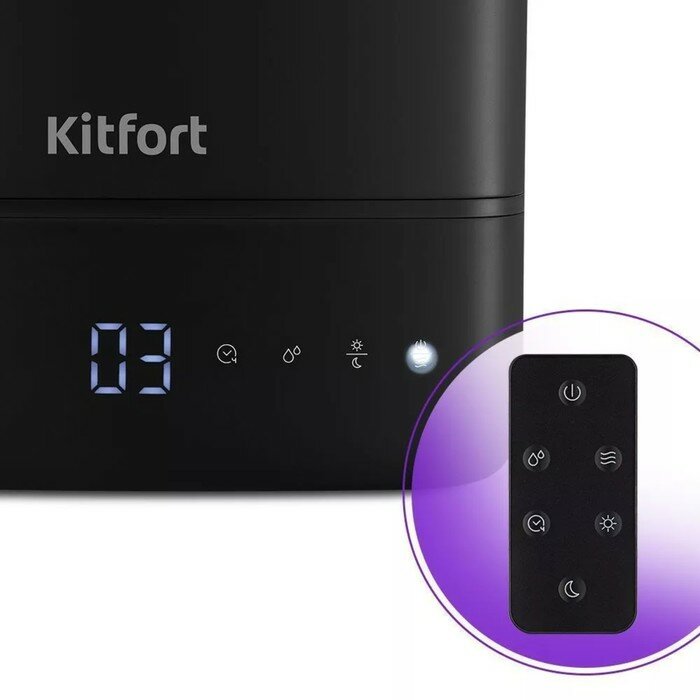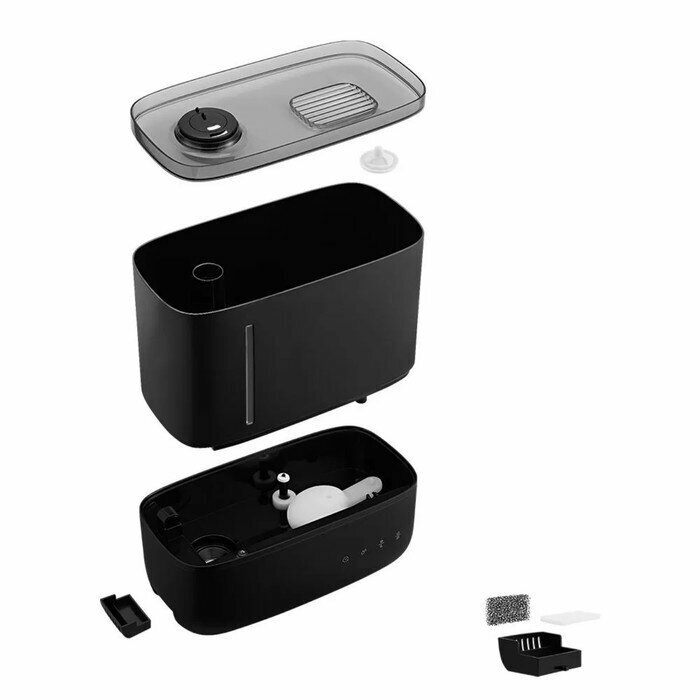 1. Humidifier - 1 pc. • Cover with nozzle - 1 pc. • Water tank - 1 pc. • Filter — 1 pc. • Aromatization bath with sponge and dust filter - 1 pc. • Humidifier base - 1 pc. 2. Remote control
